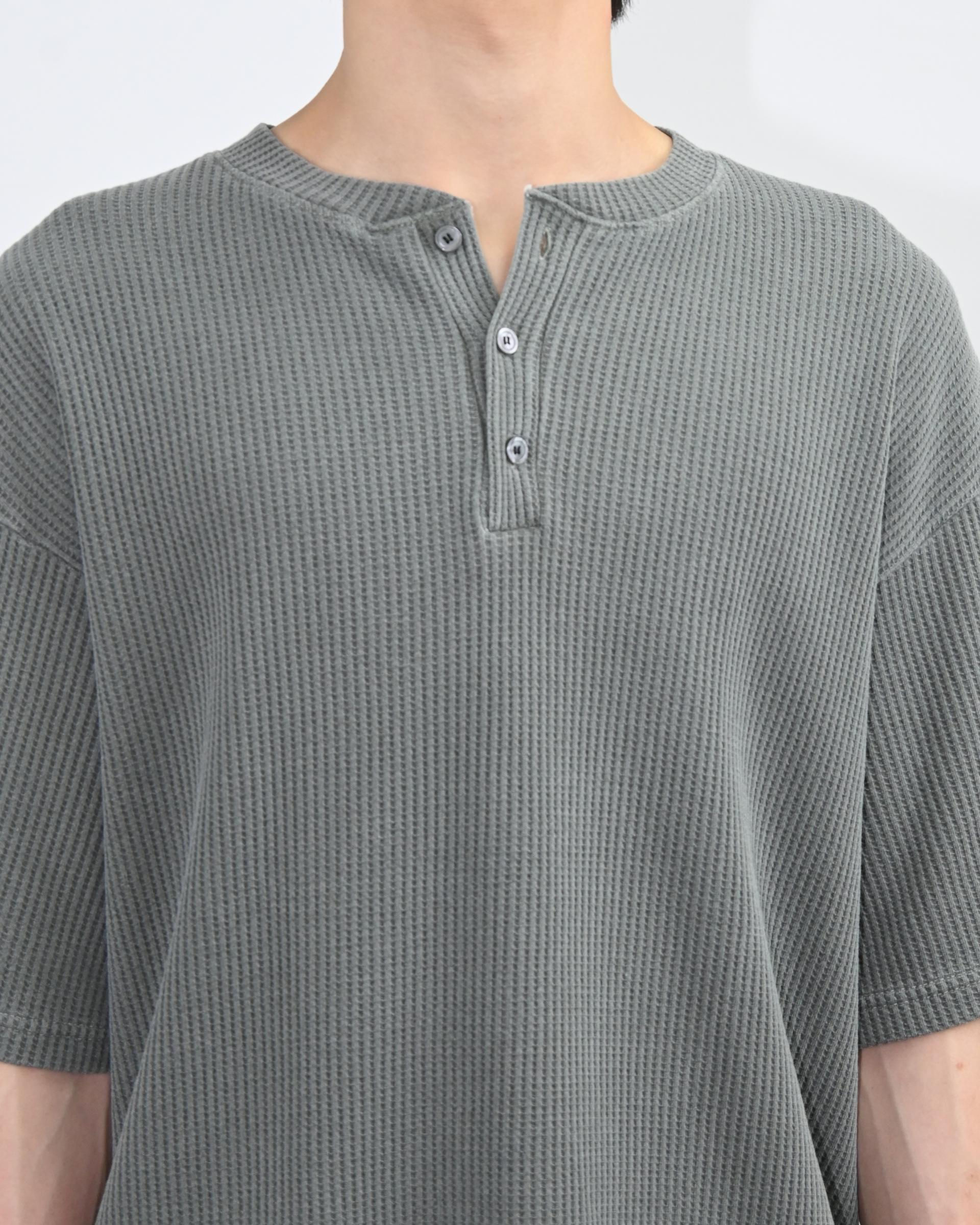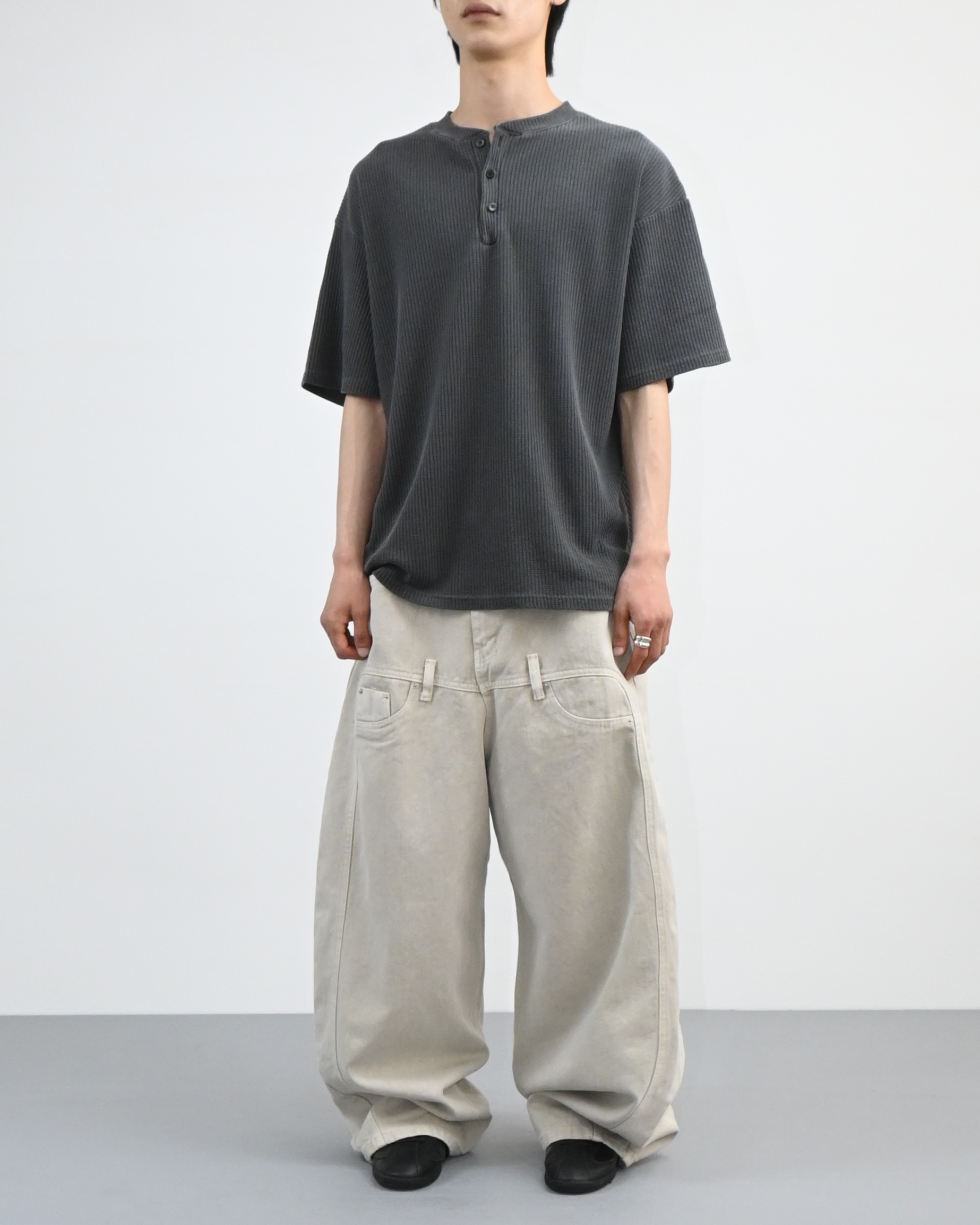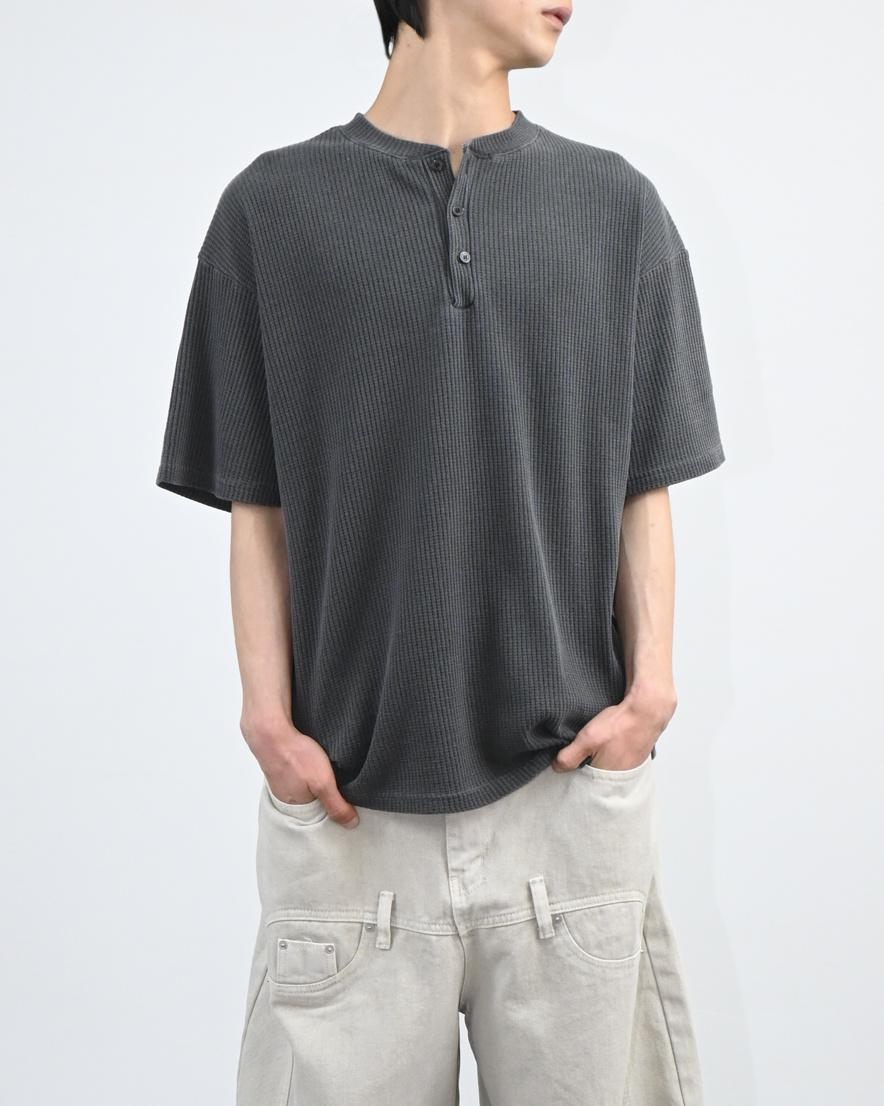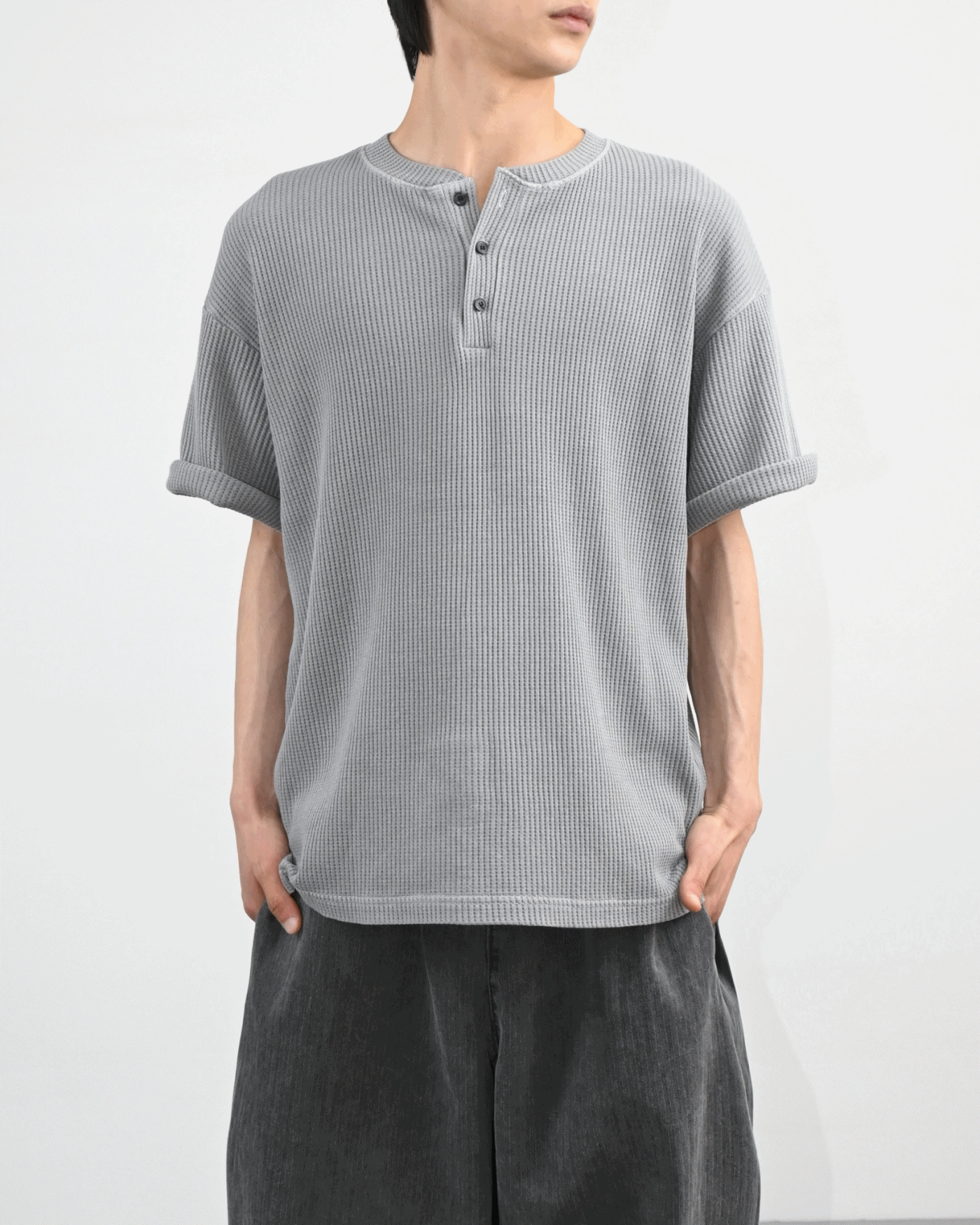 헨리넥 버튼 디테일로 캐주얼한 포인트를 더했고,