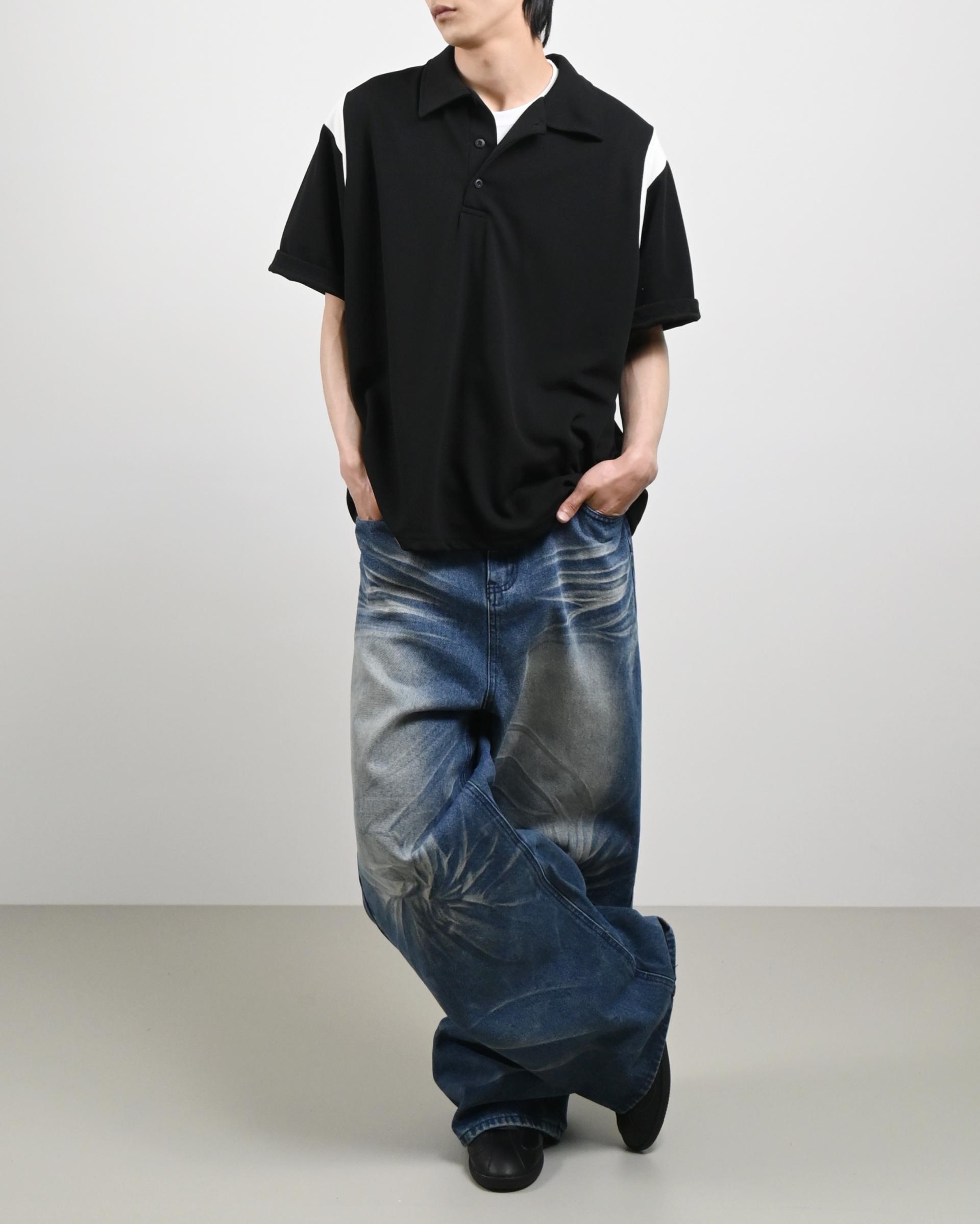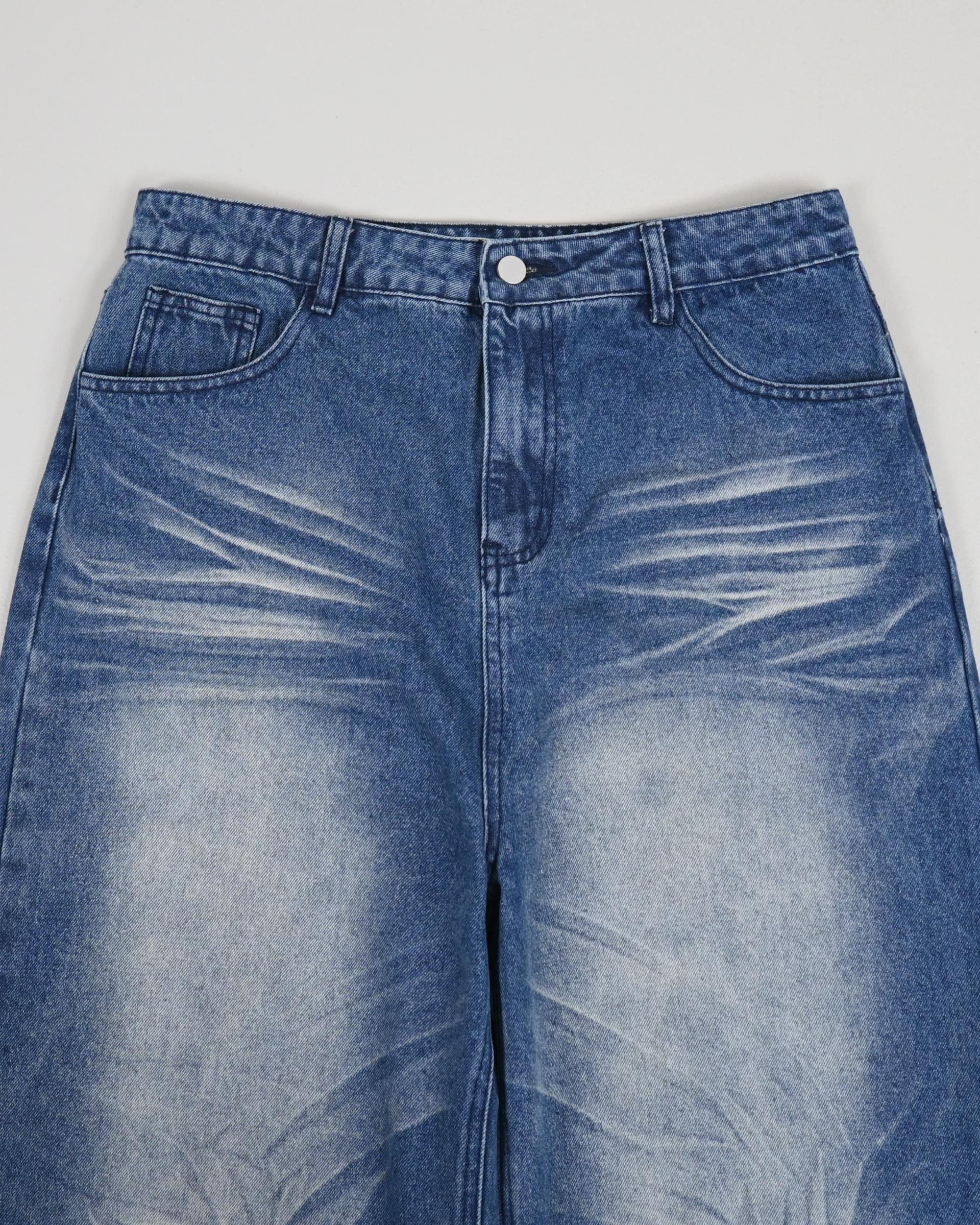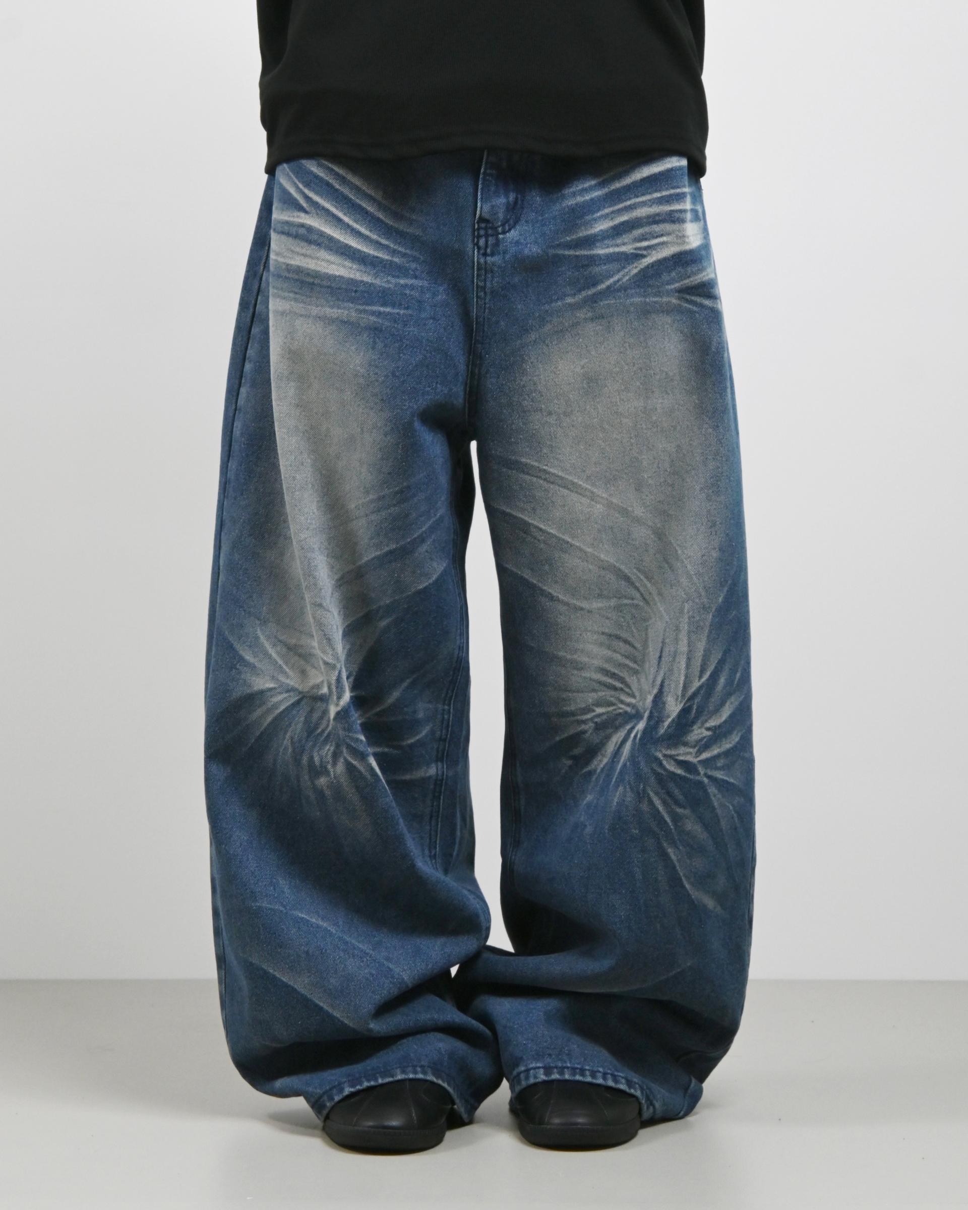 밝은 워싱색과 무릎 워싱 기법이 돋보이며,