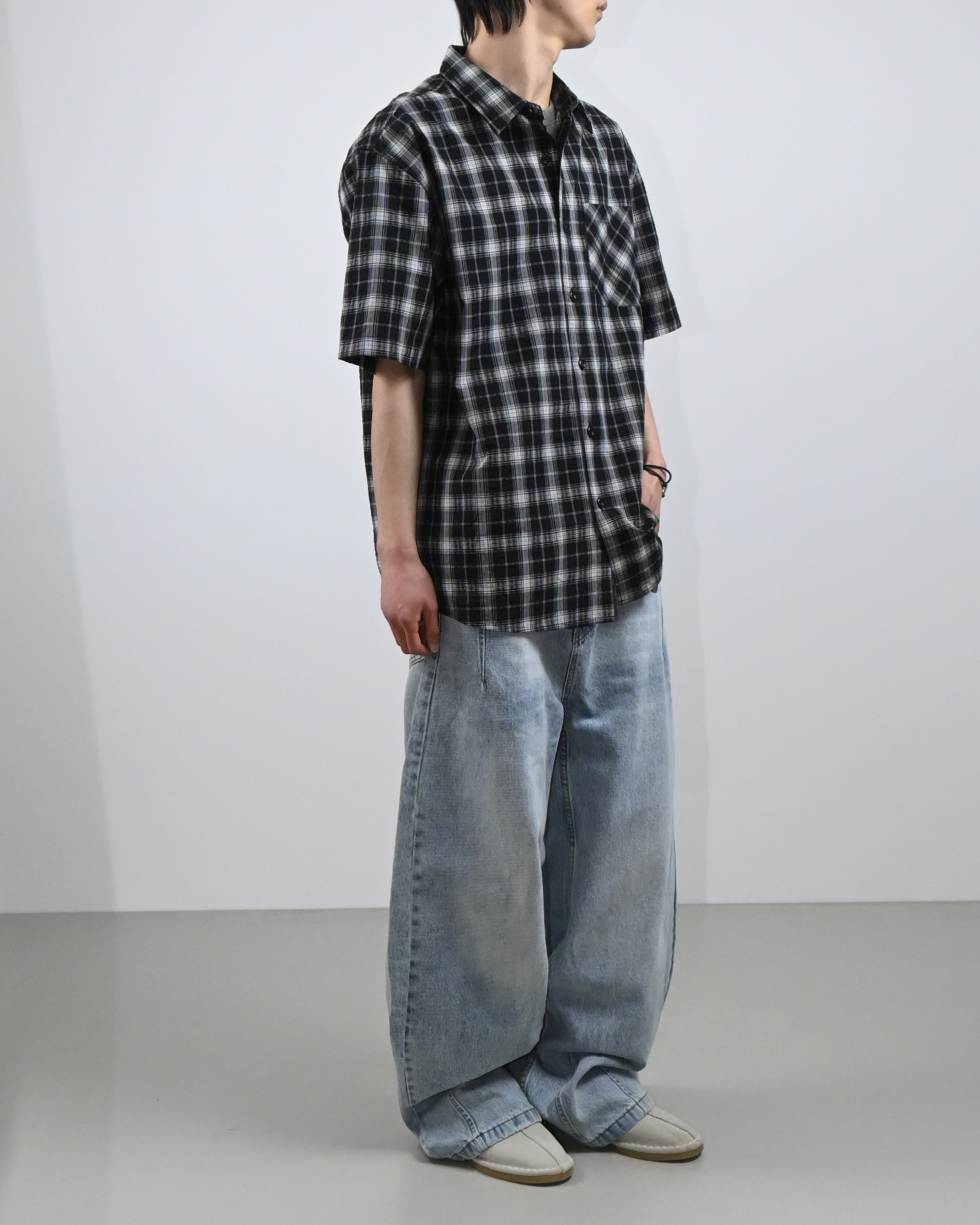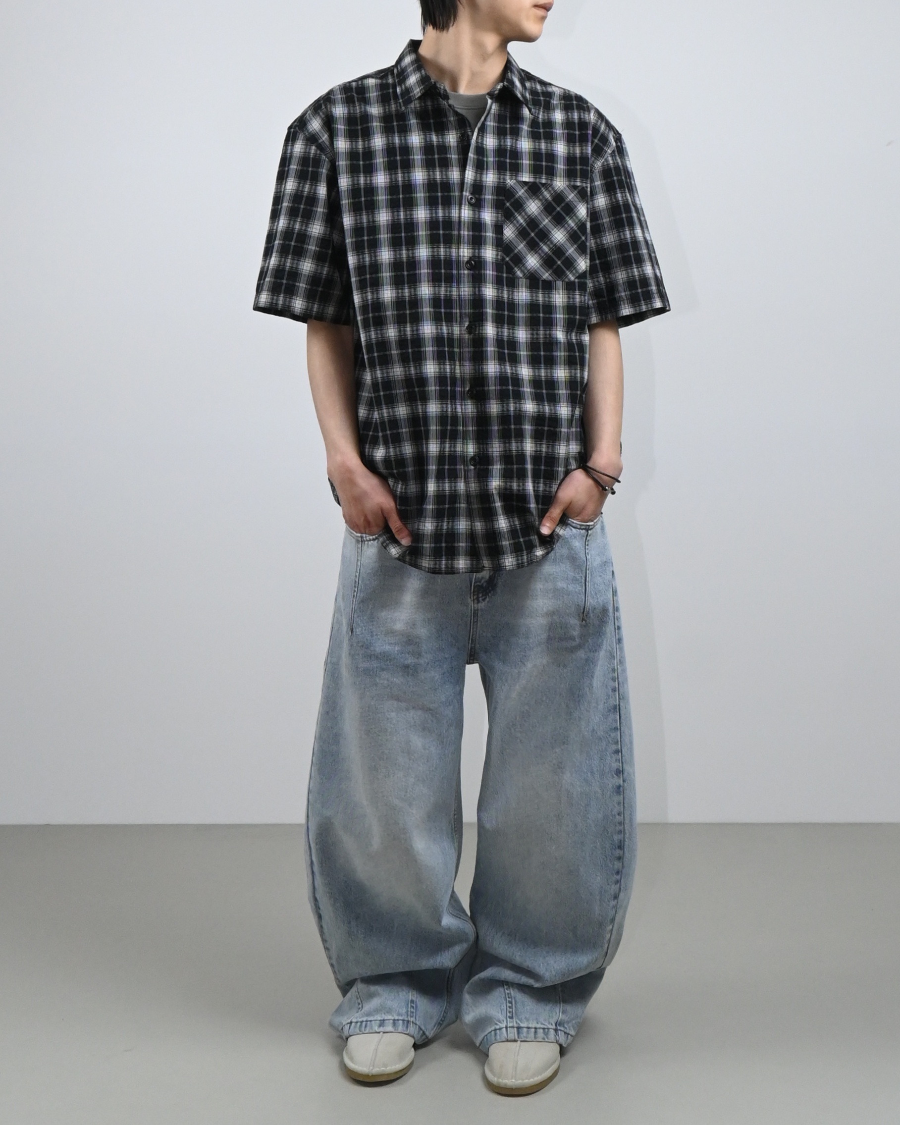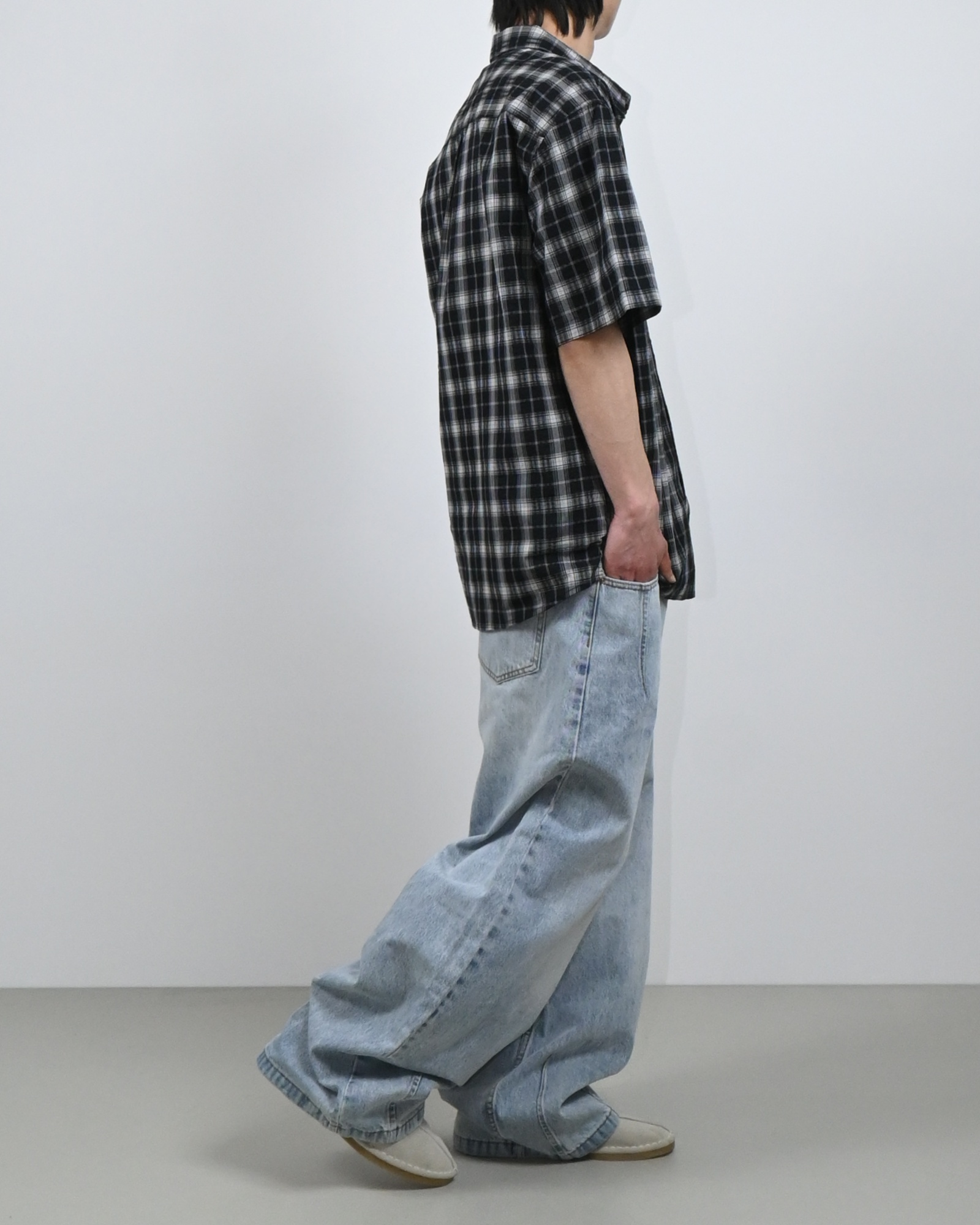 여유로운 벌룬핏에 포켓과 밑단의 절개 디테일,