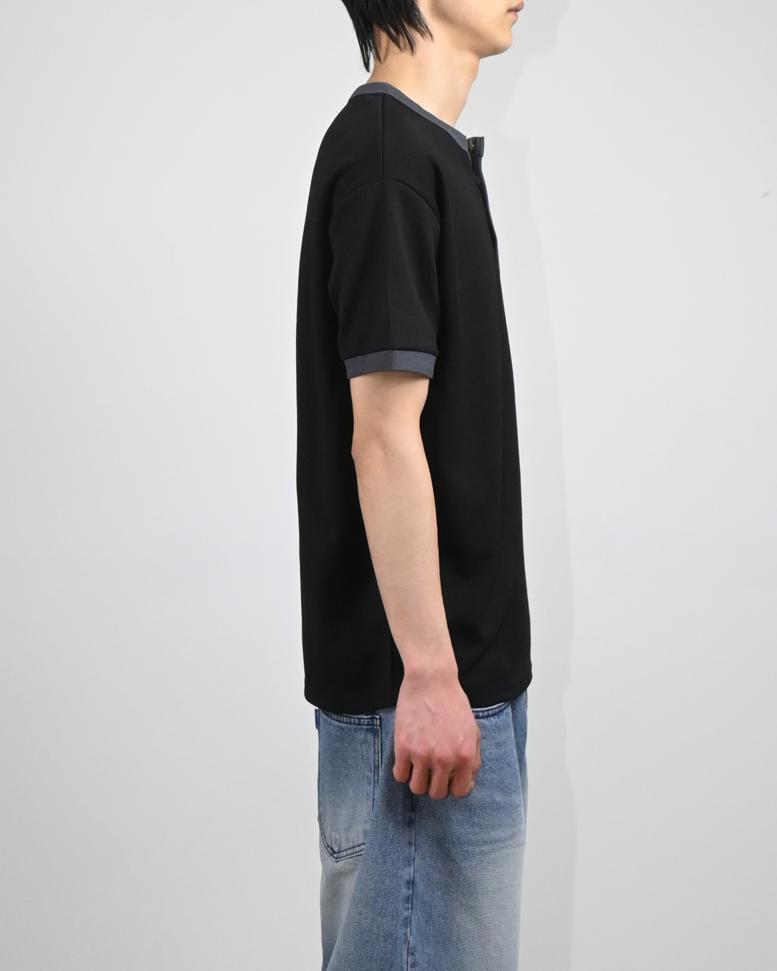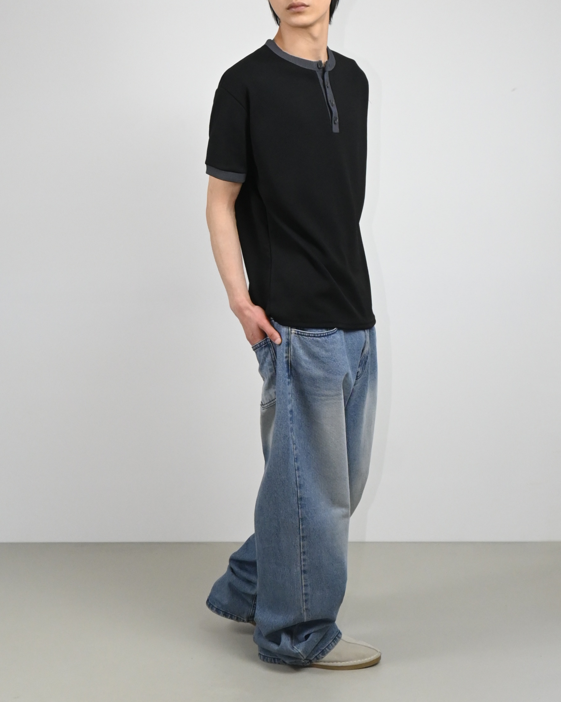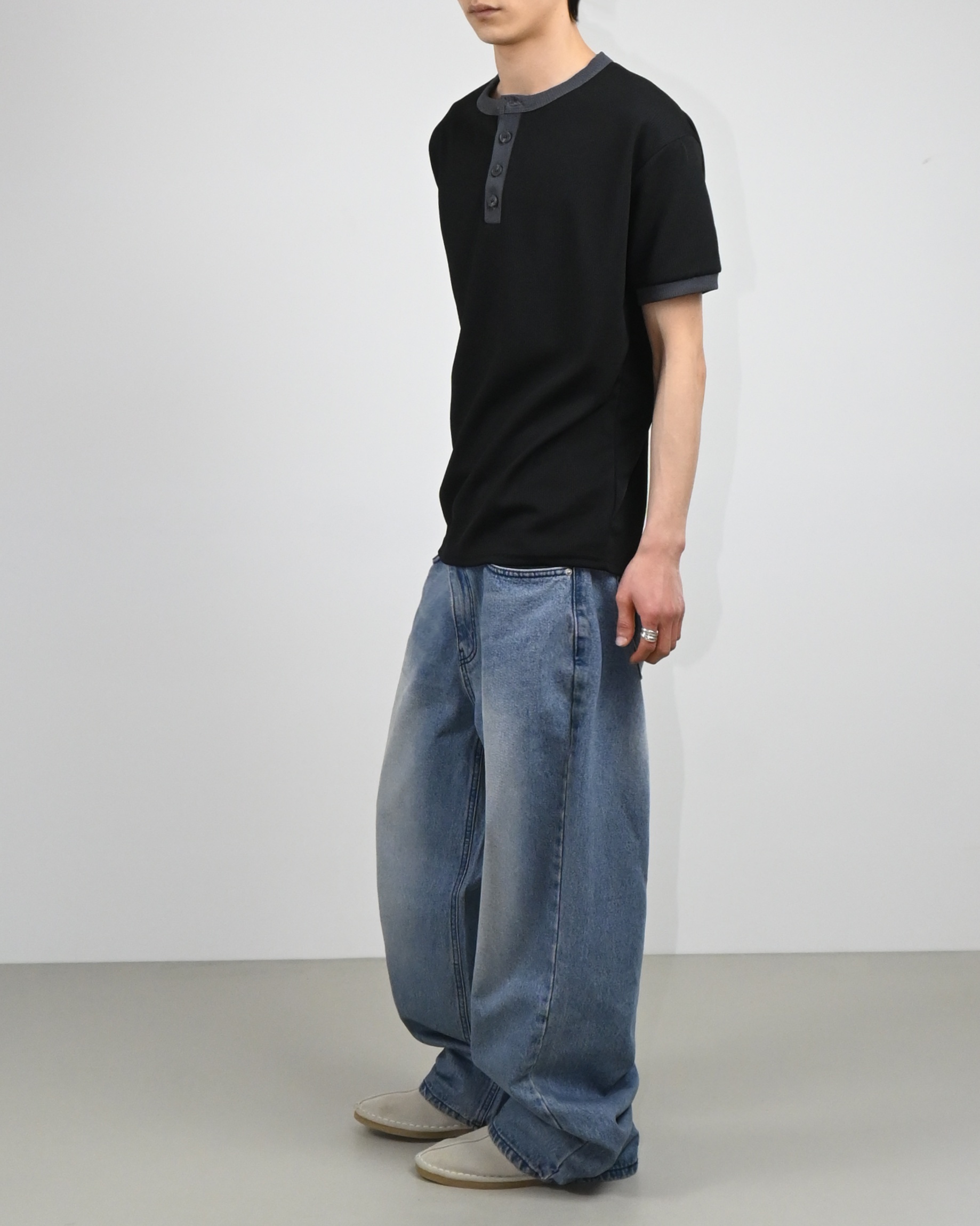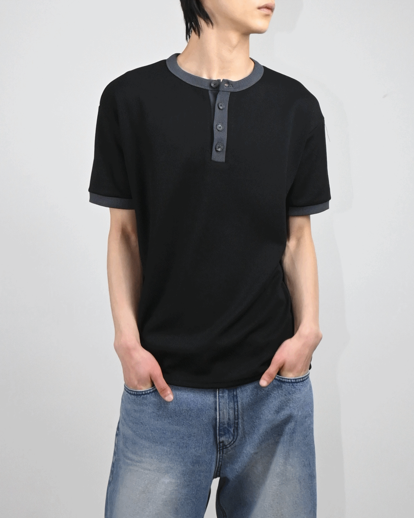 링거 헨리넥 반팔 티셔츠입니다.