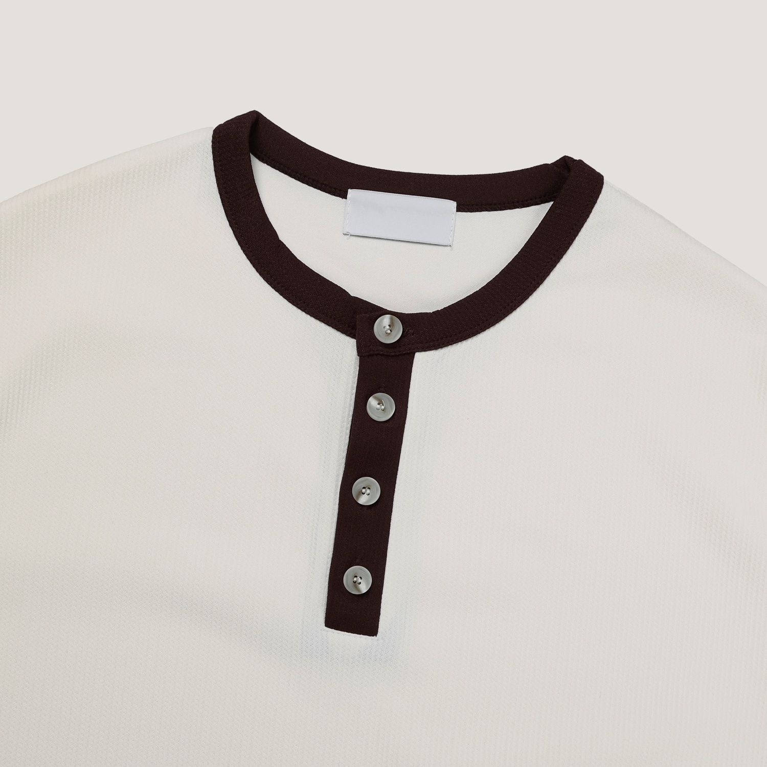 스냅 디테일과 깔끔한 헨리넥 디자인으로