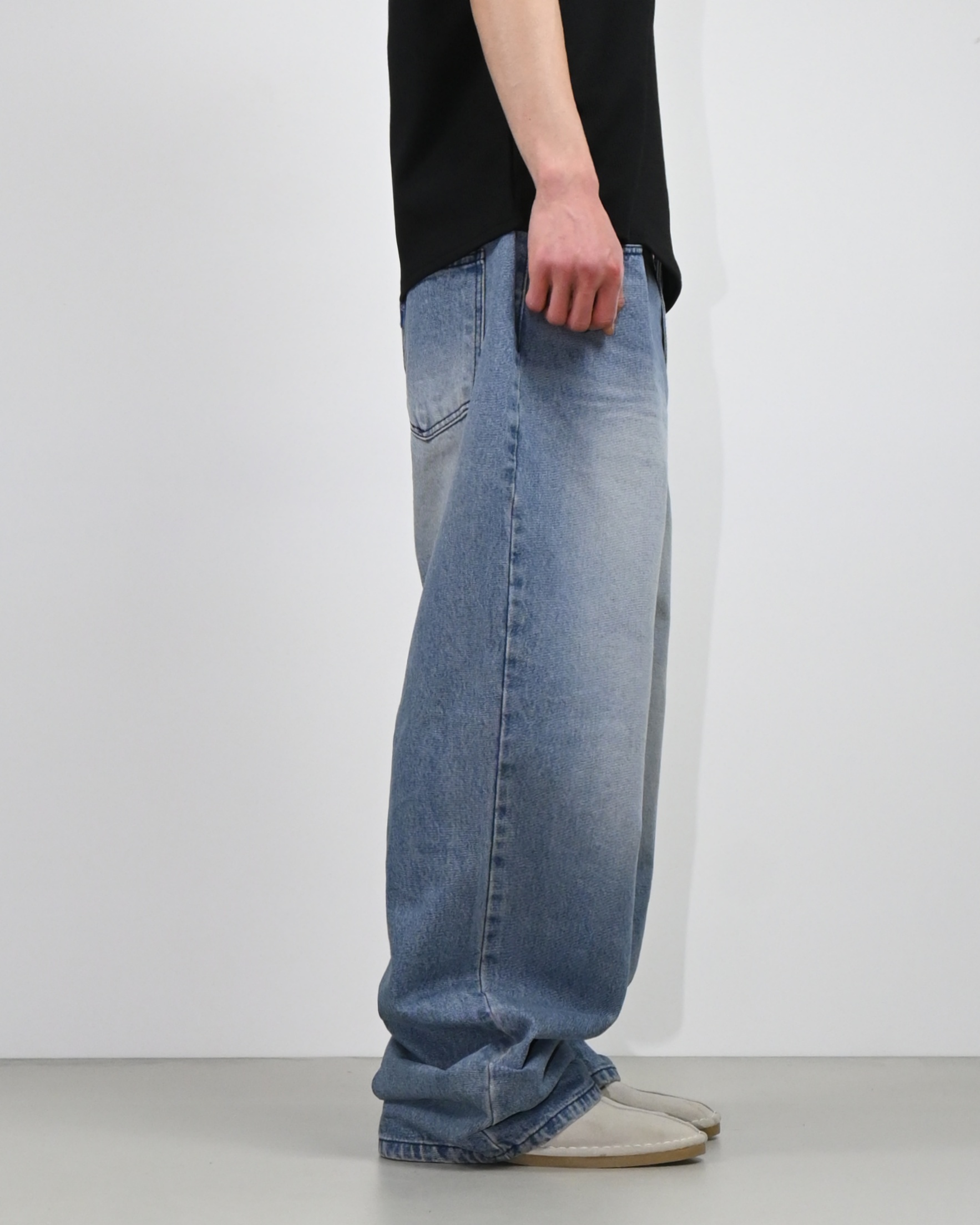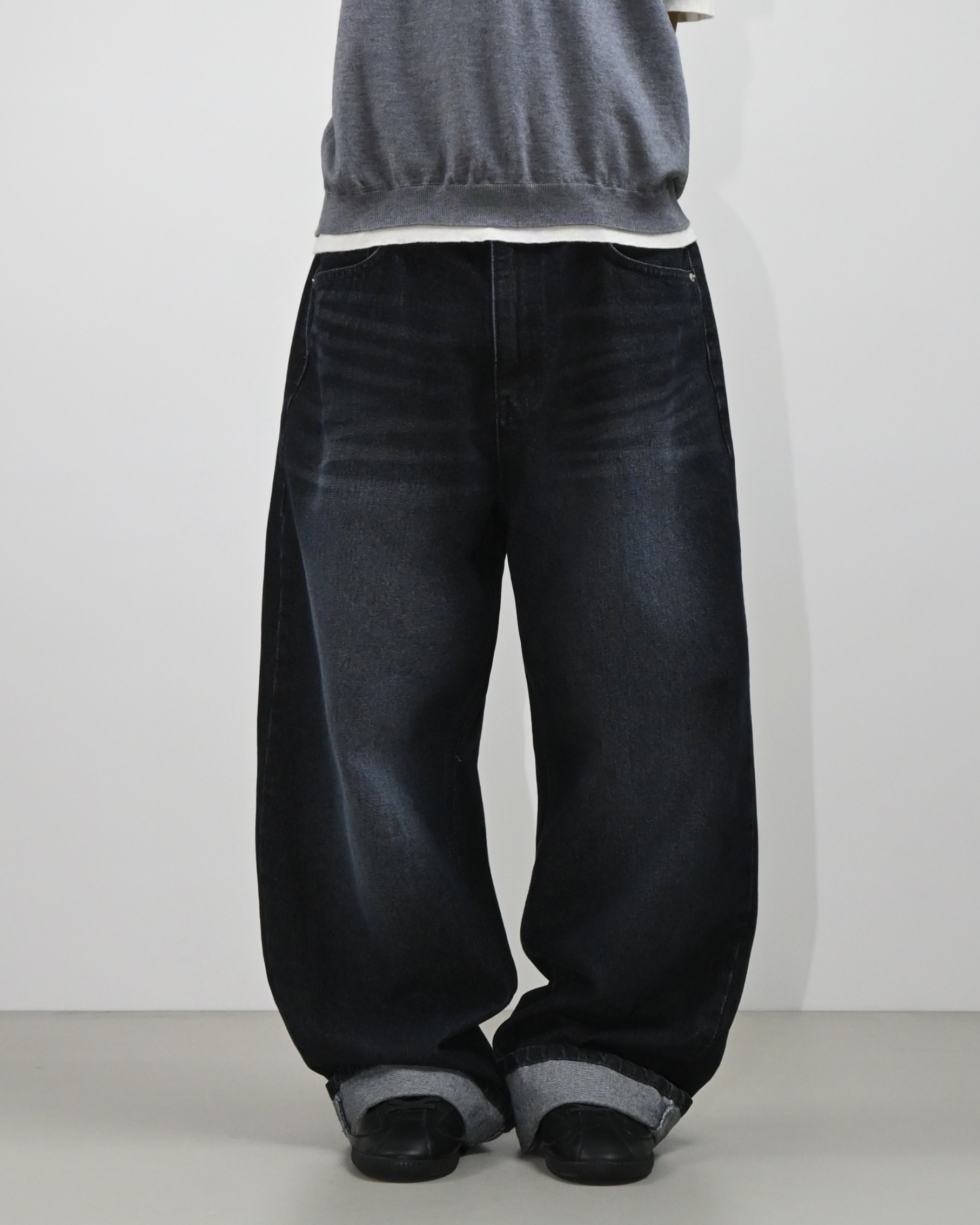 여유로운 벌룬핏에 포켓과 밑단의 절개 디테일,