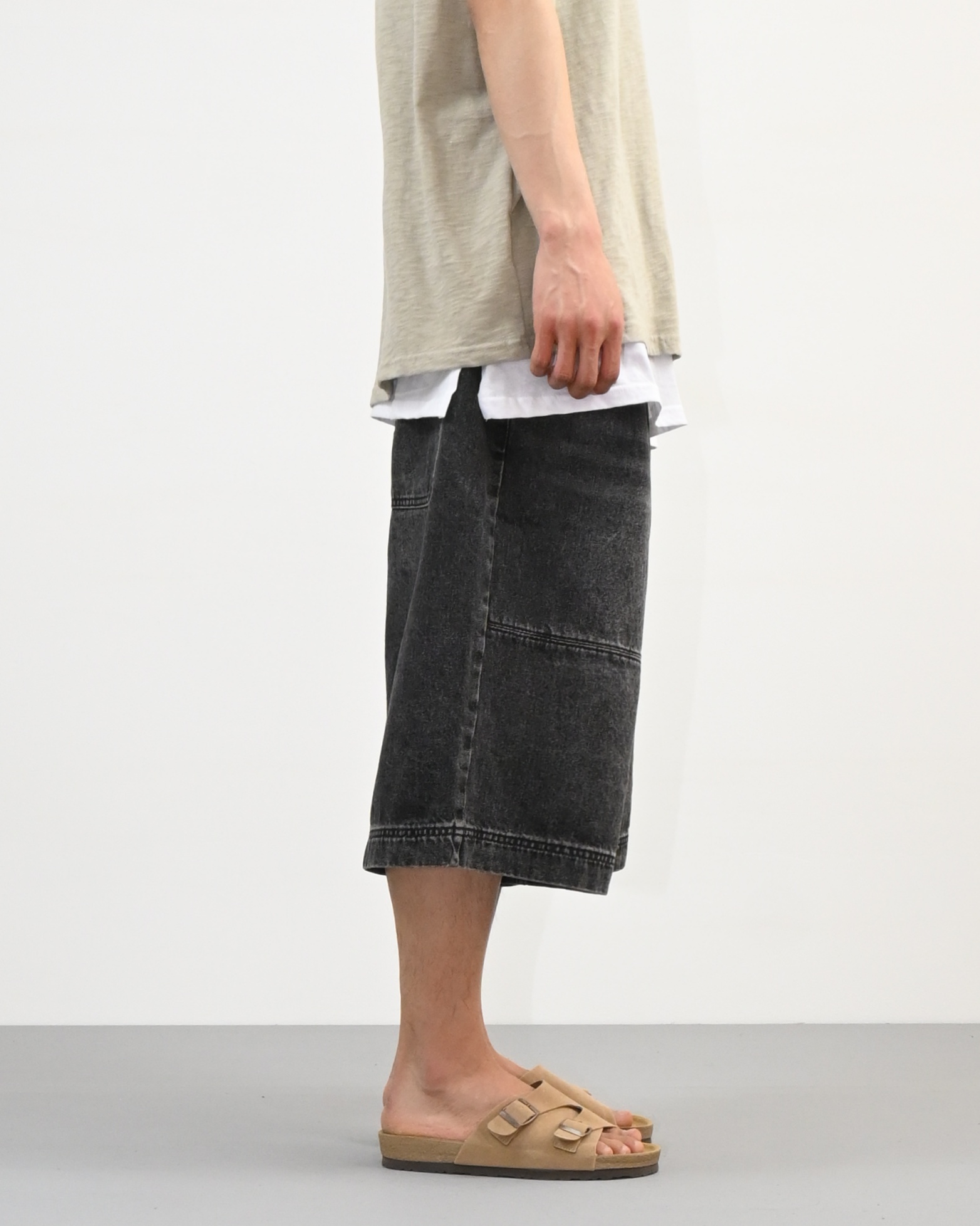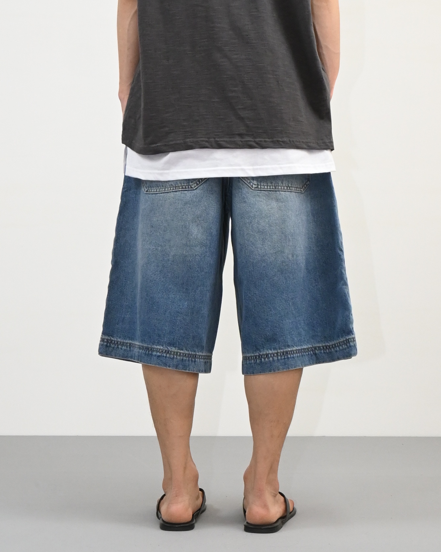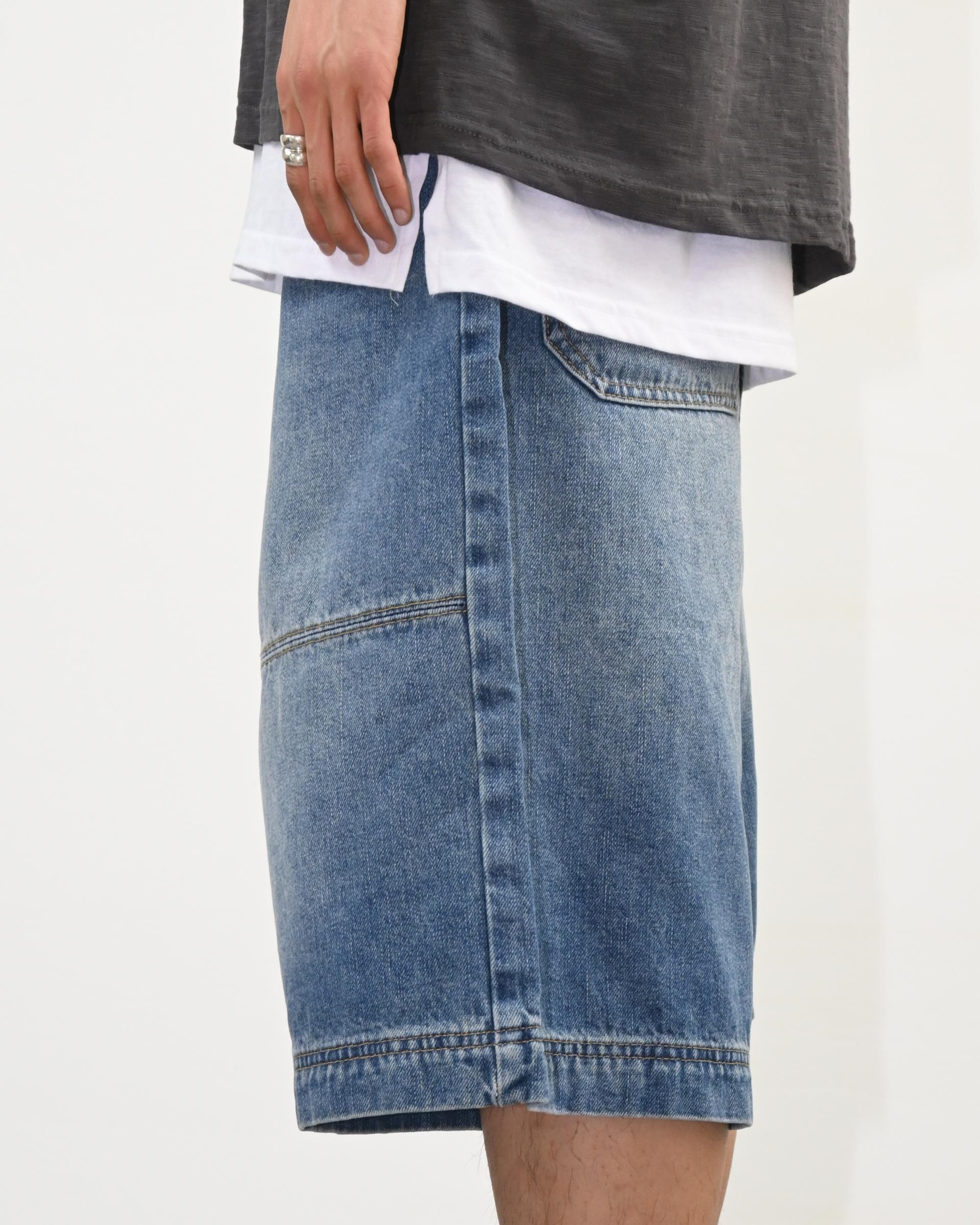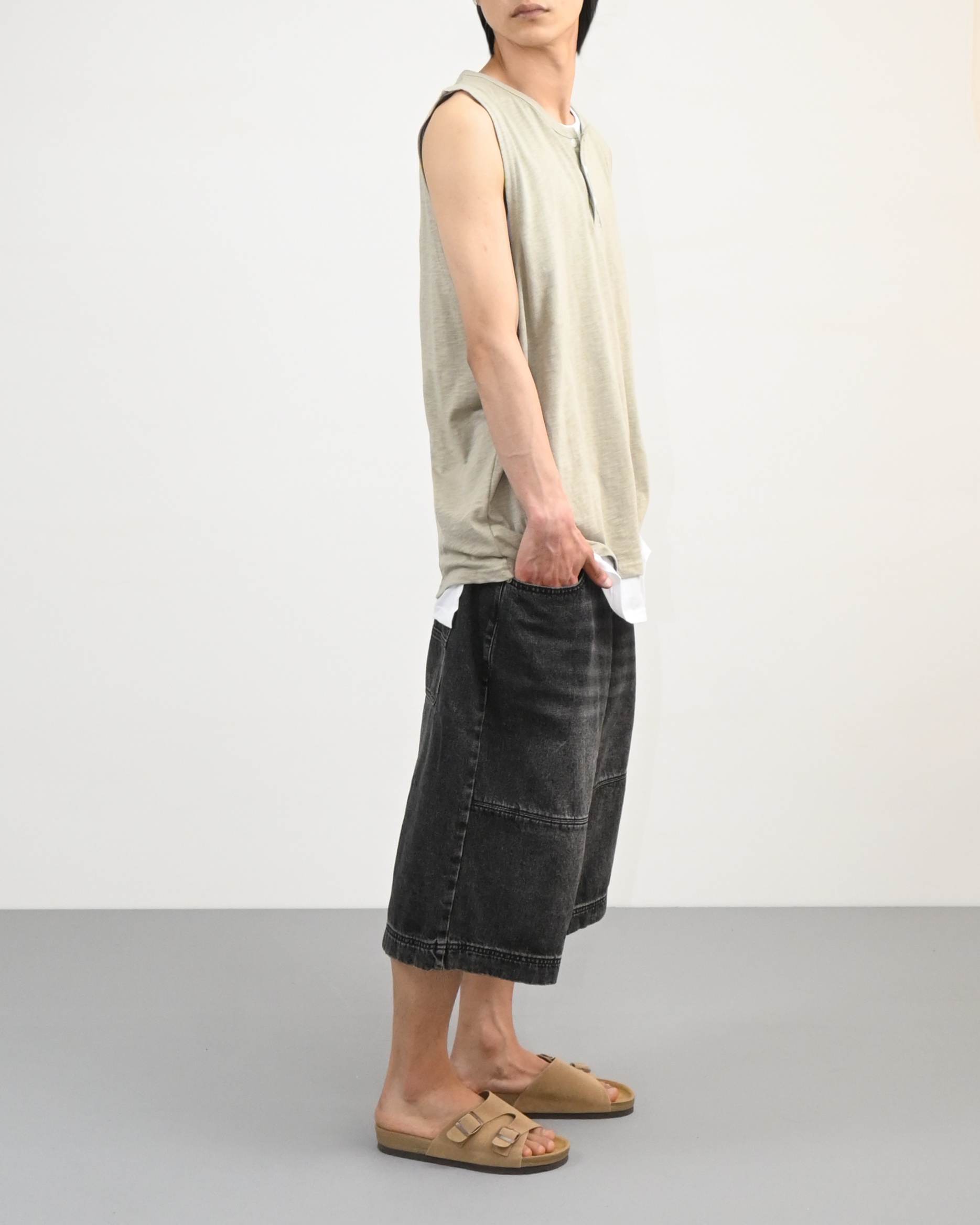 절개라인이 돋보이는 버뮤다 데님 팬츠입니다.