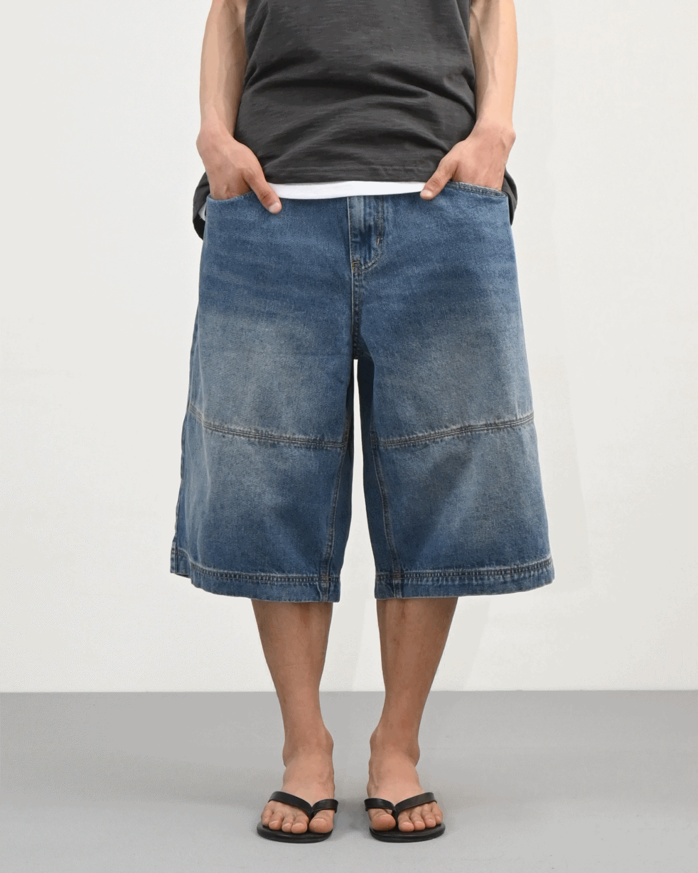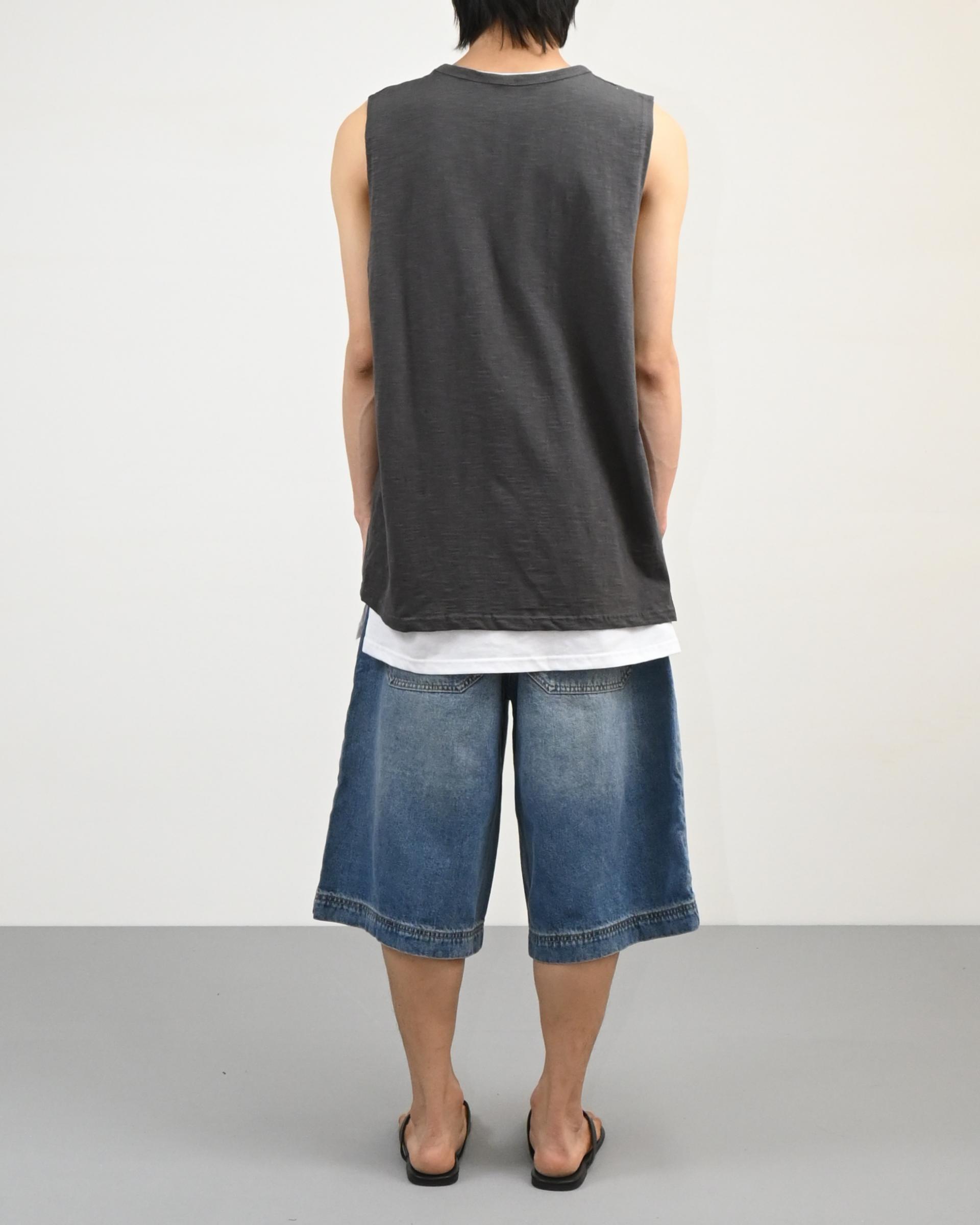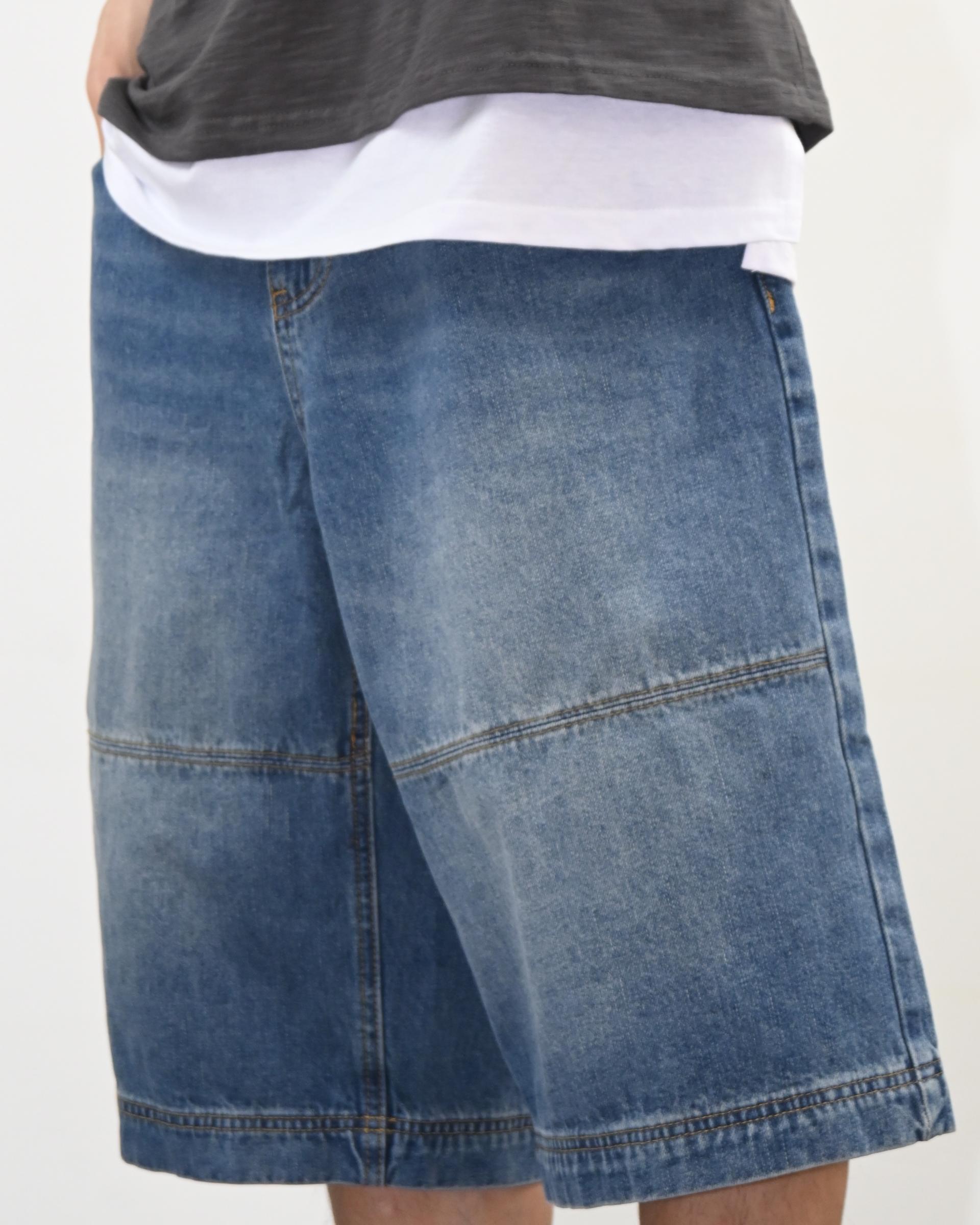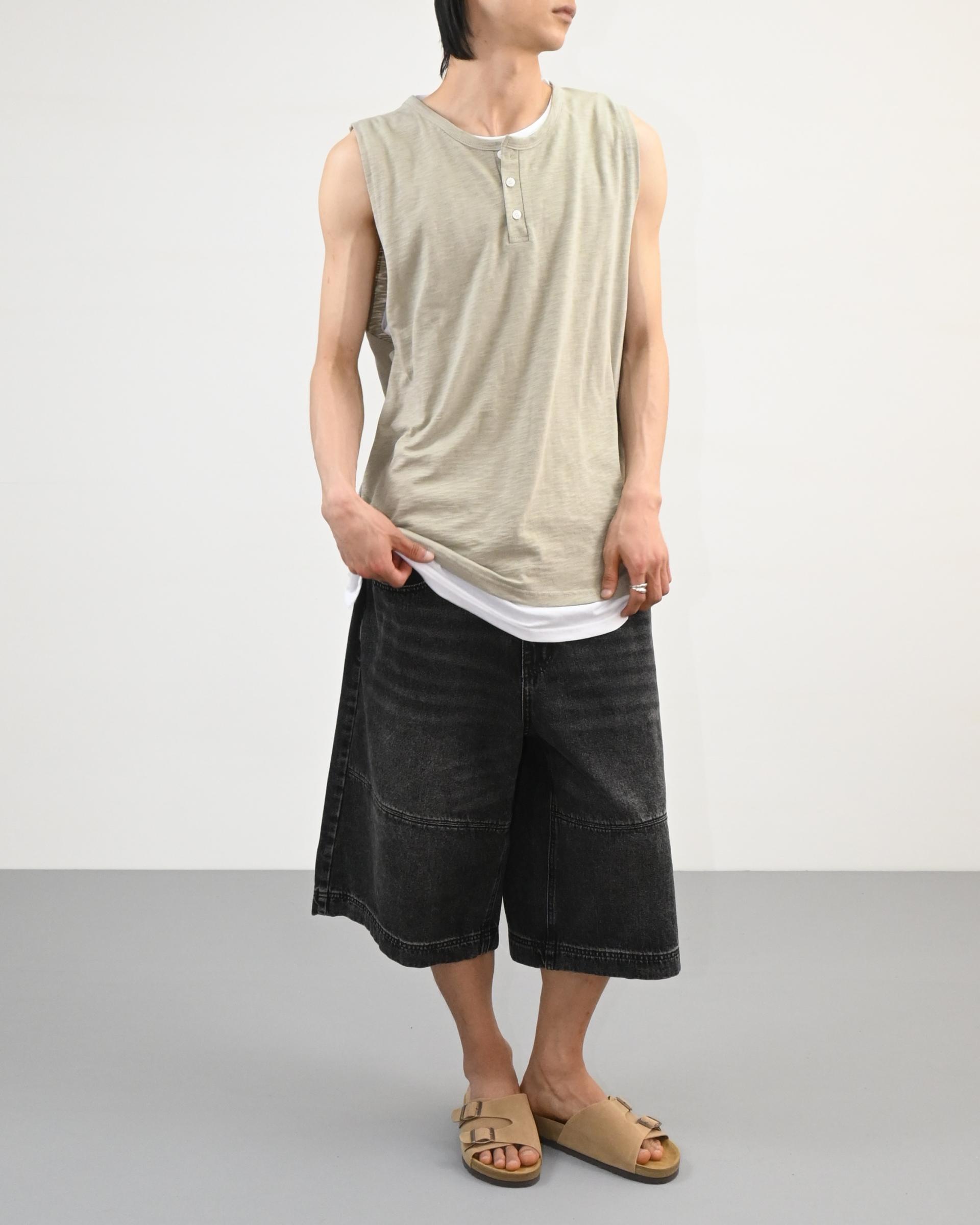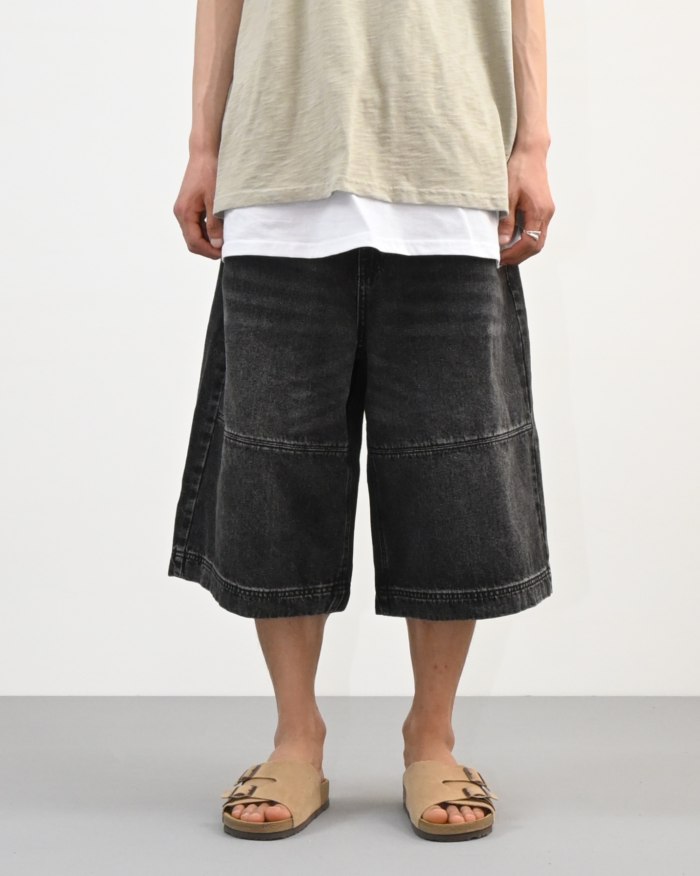 절개라인이 돋보이는 버뮤다 데님 팬츠입니다.