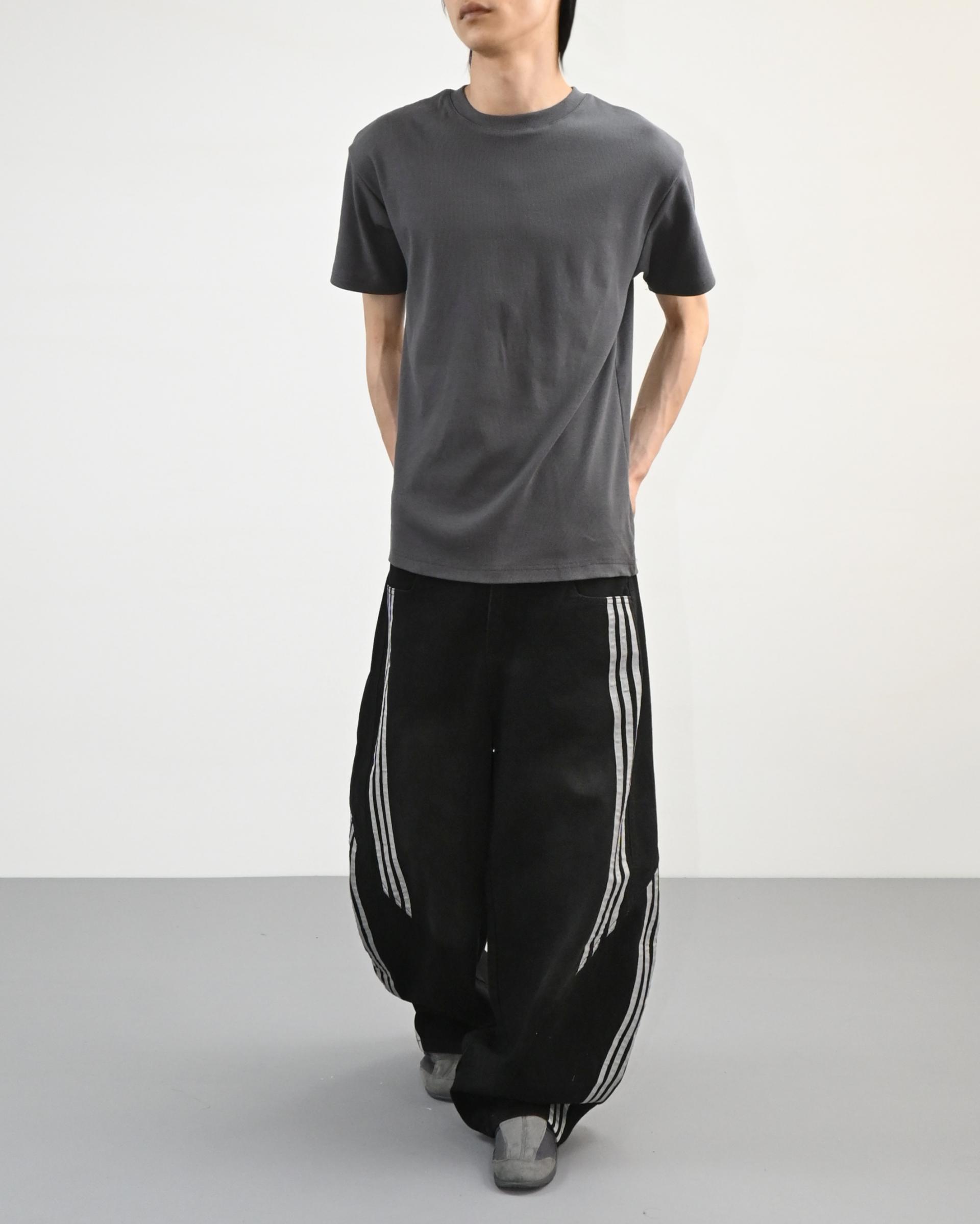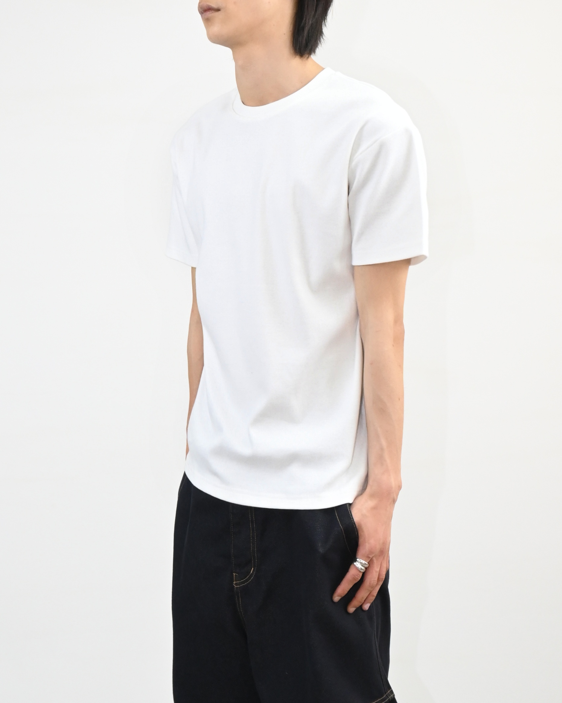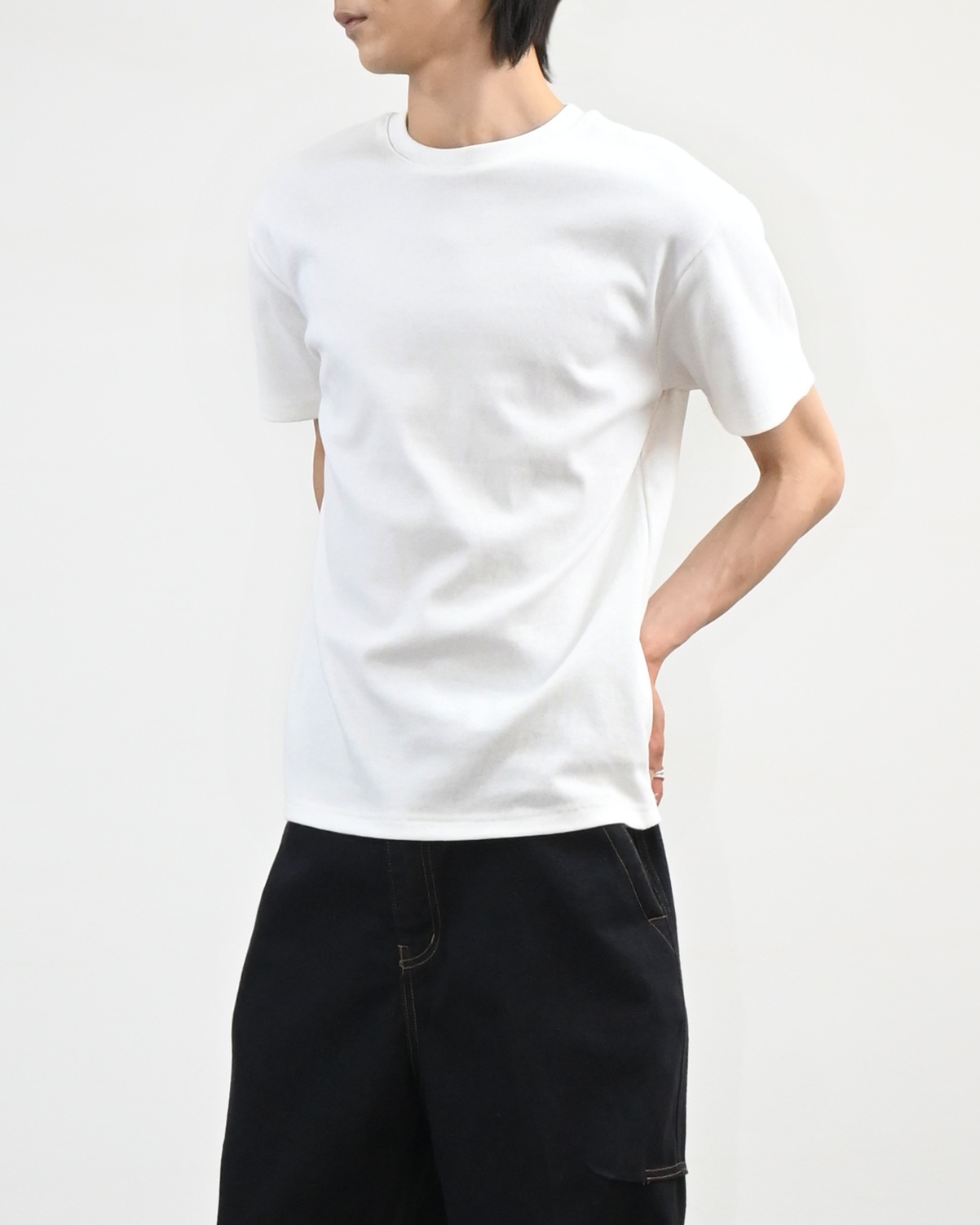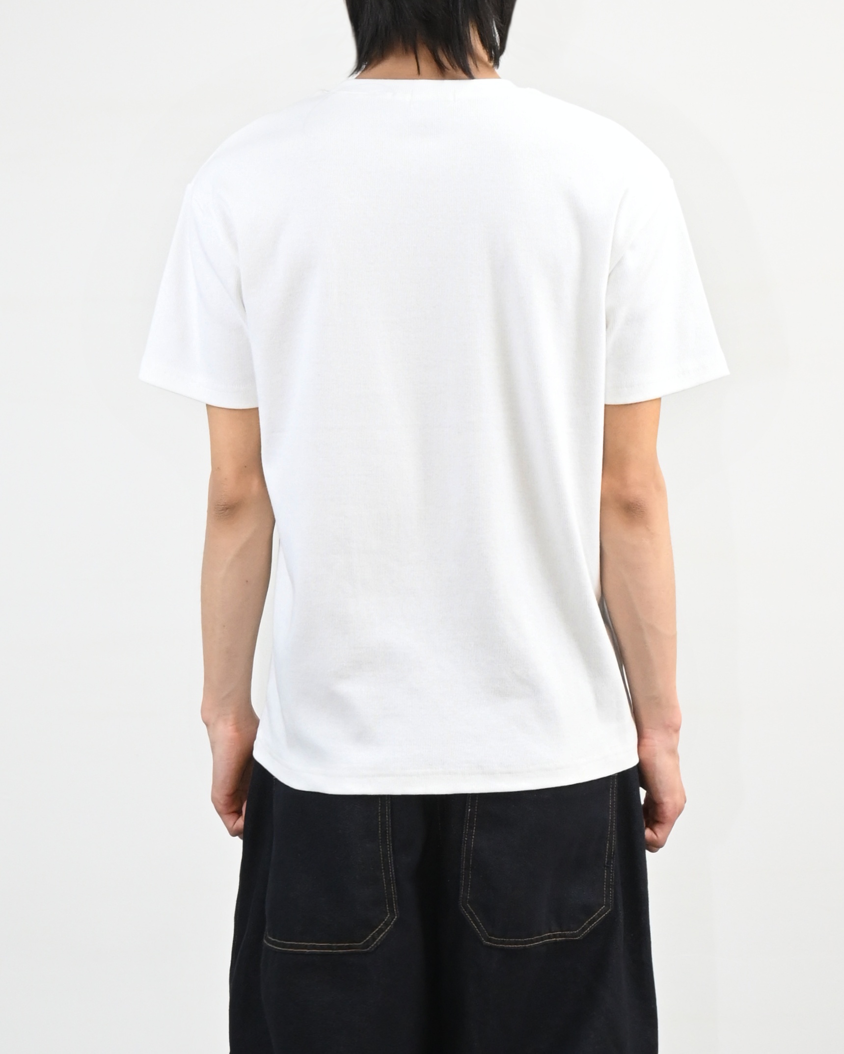 크롭 기장으로 떨어지는 골지 반팔 티셔츠입니다.