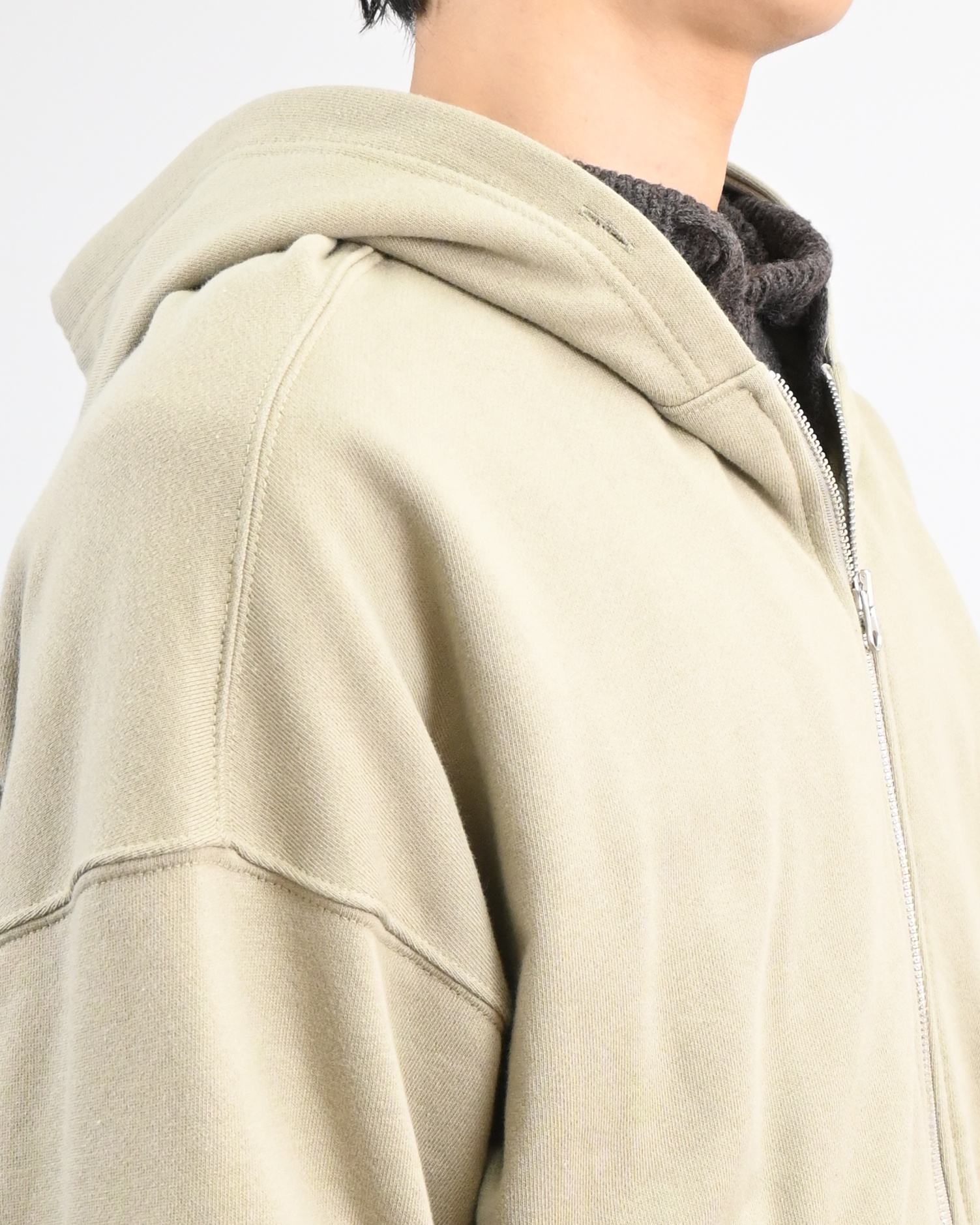 후드 전면의 단추 구멍 디테일이 있습니다.