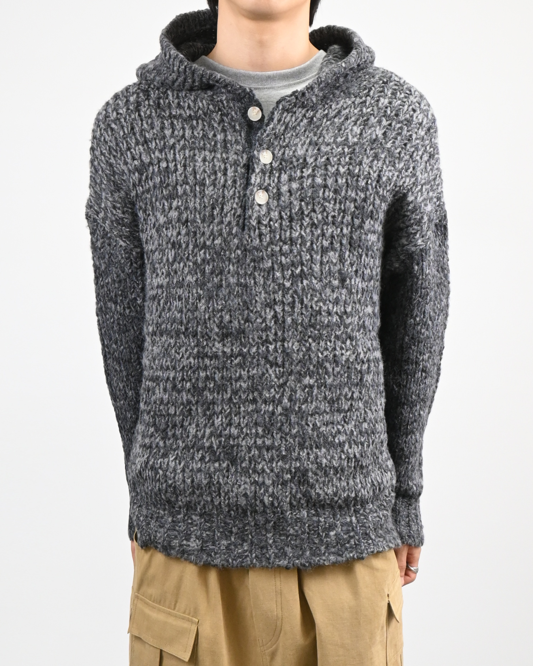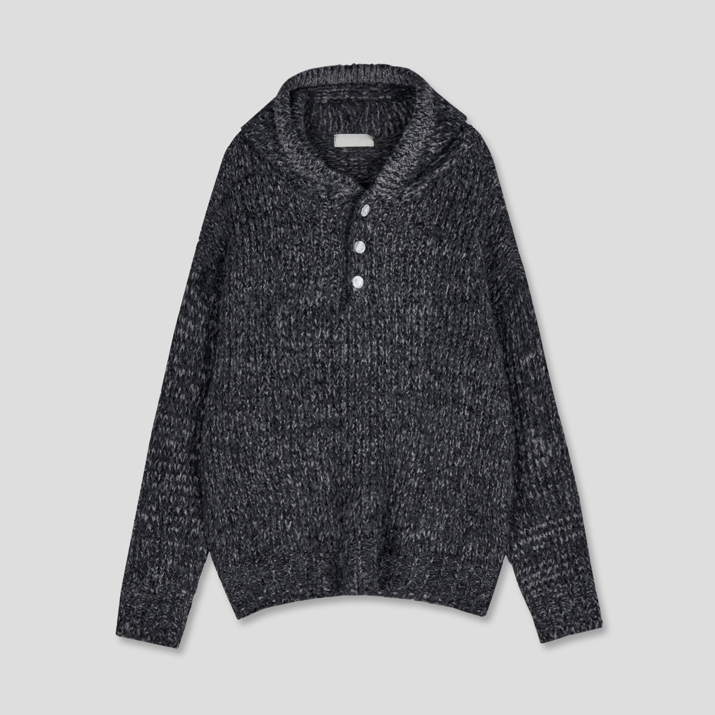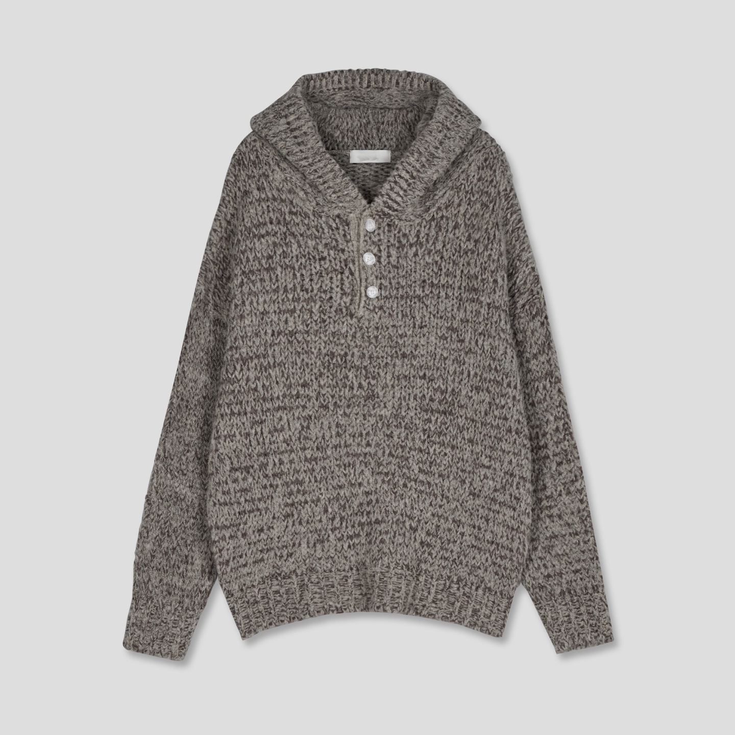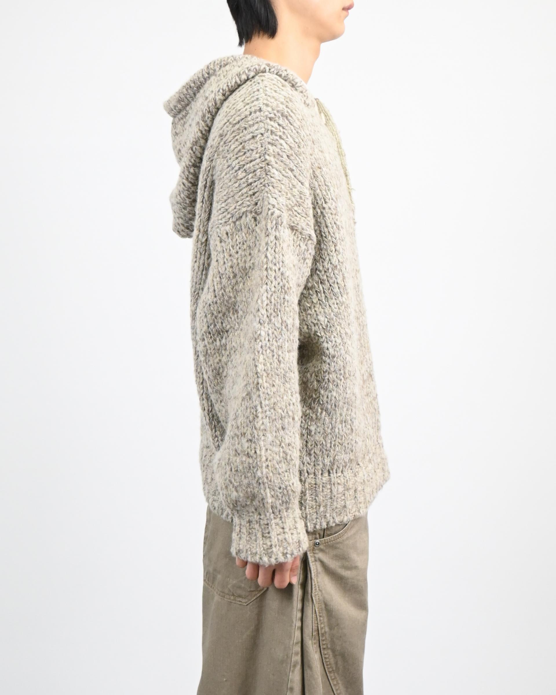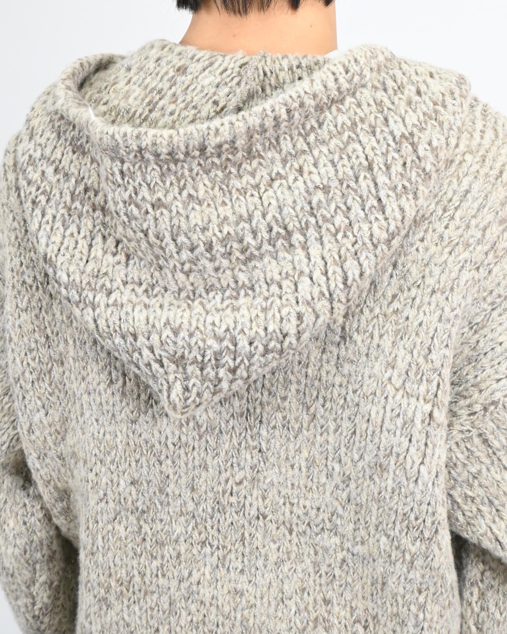 믹스된 실로 짠 후드 니트입니다.