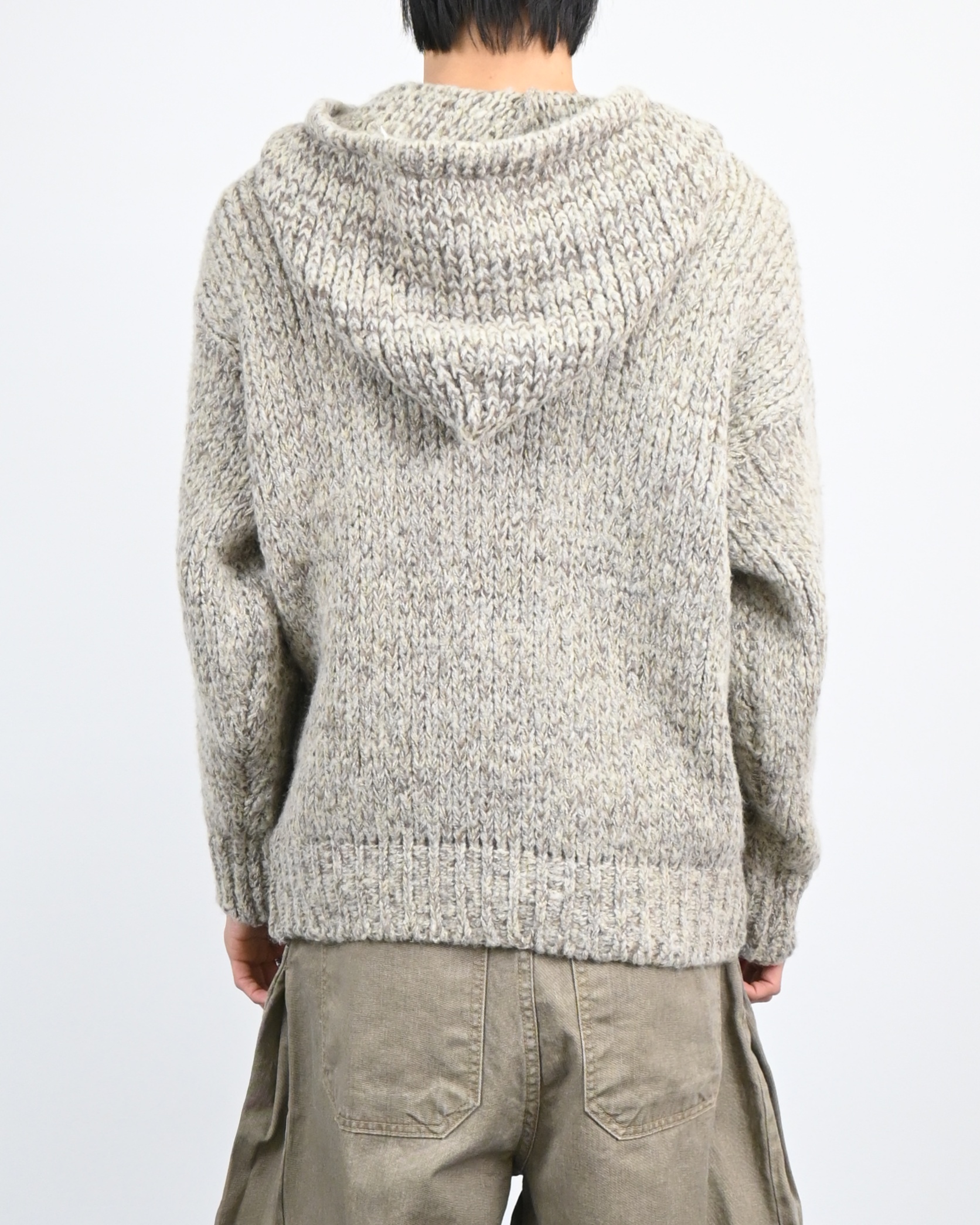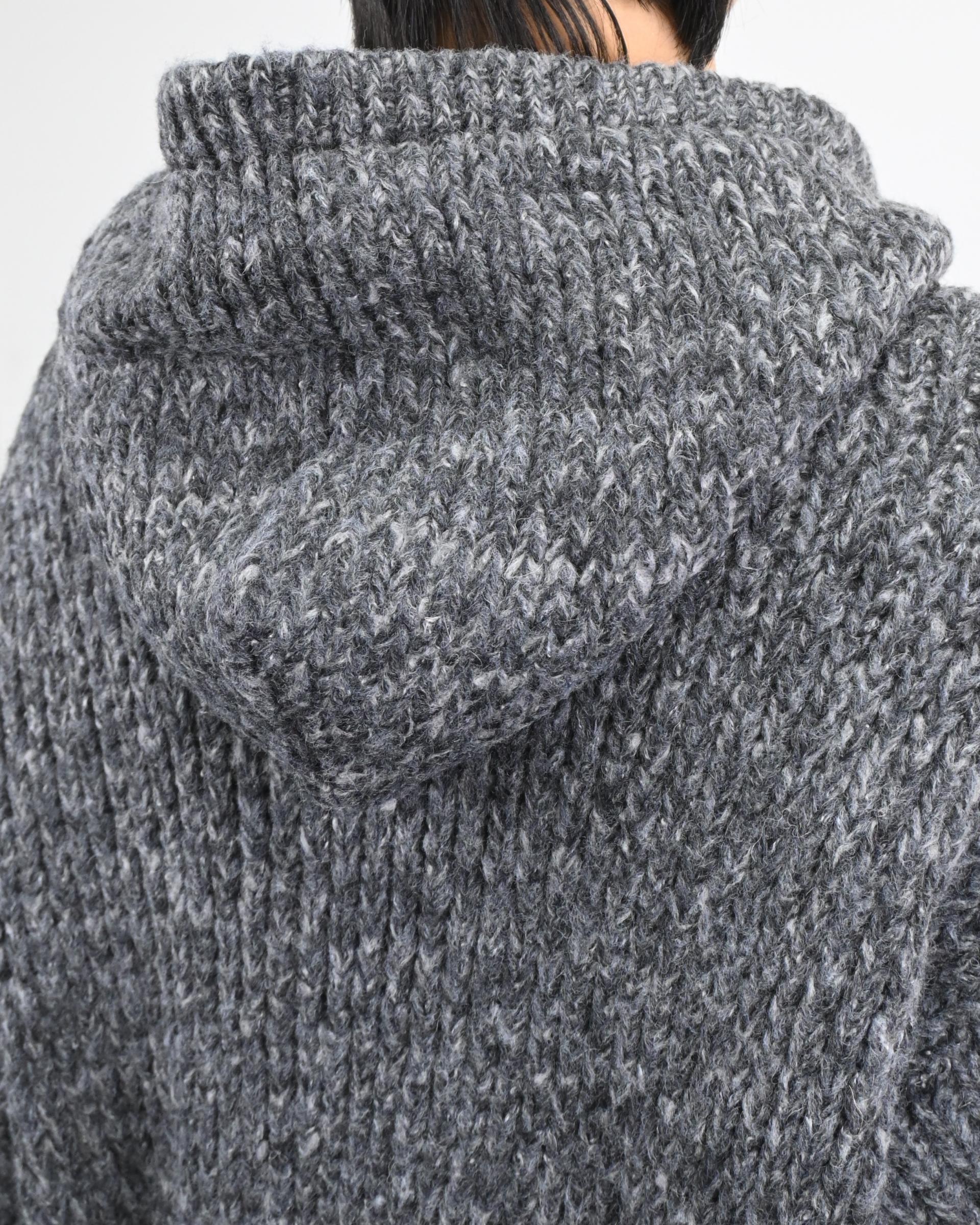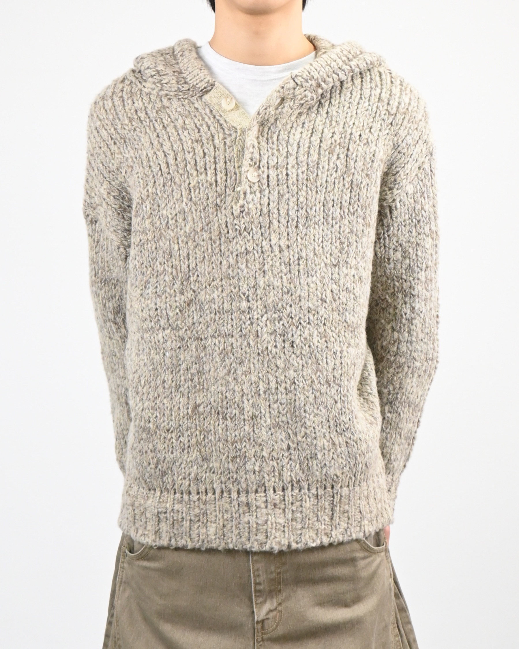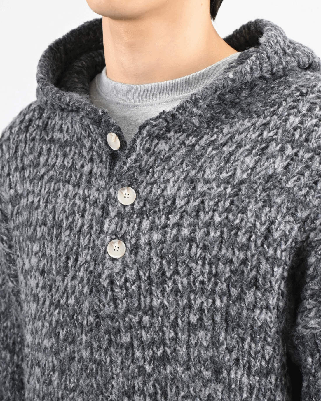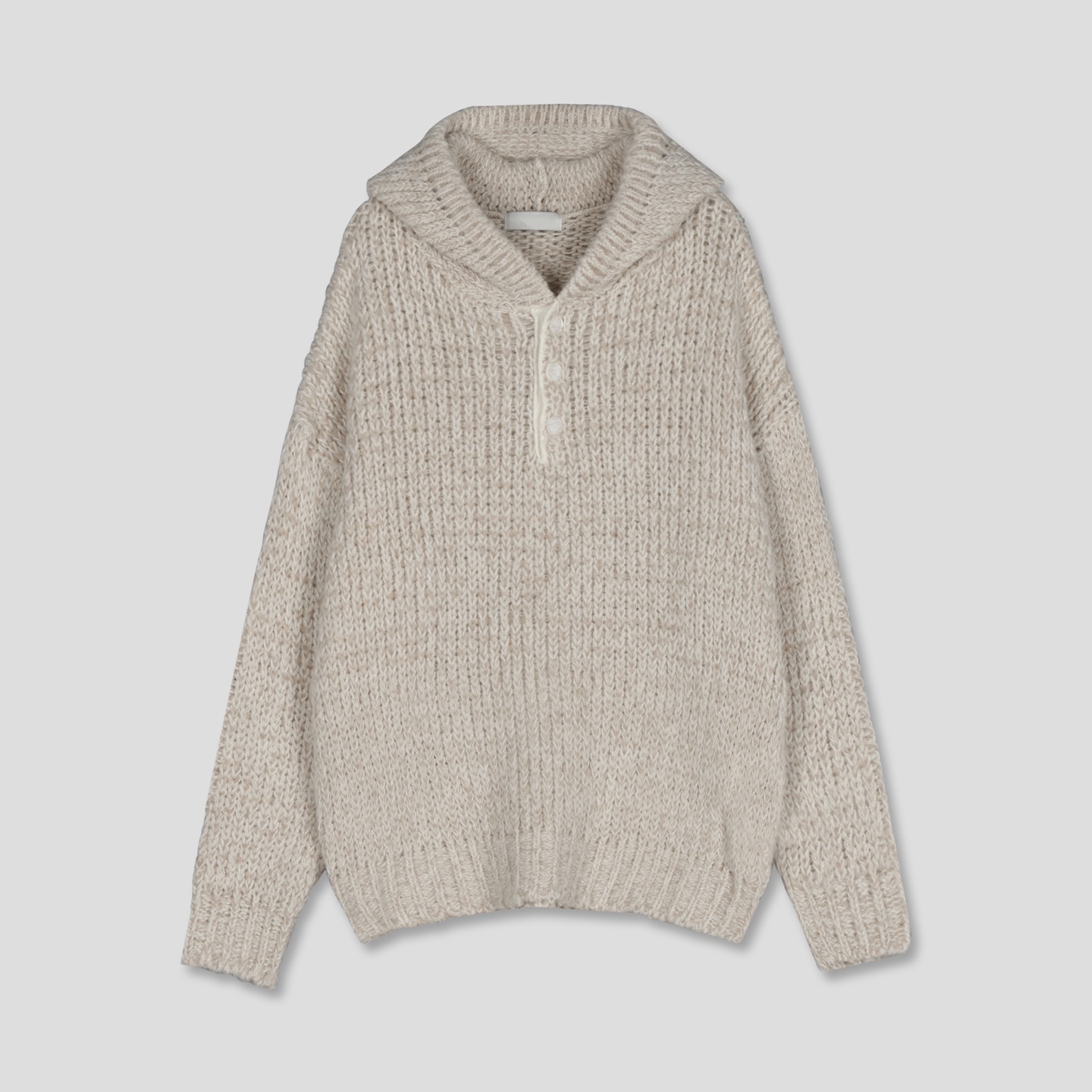 믹스된 실로 짠 후드 니트입니다.