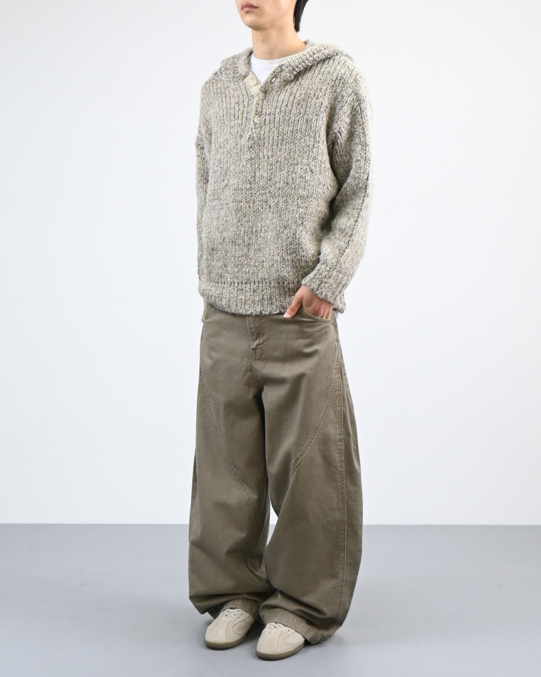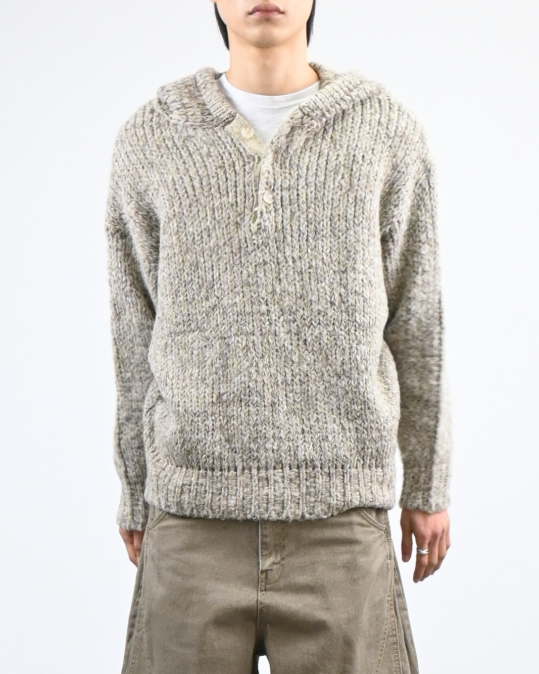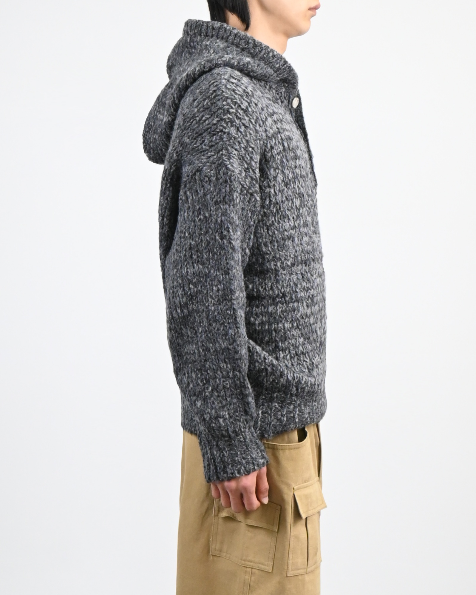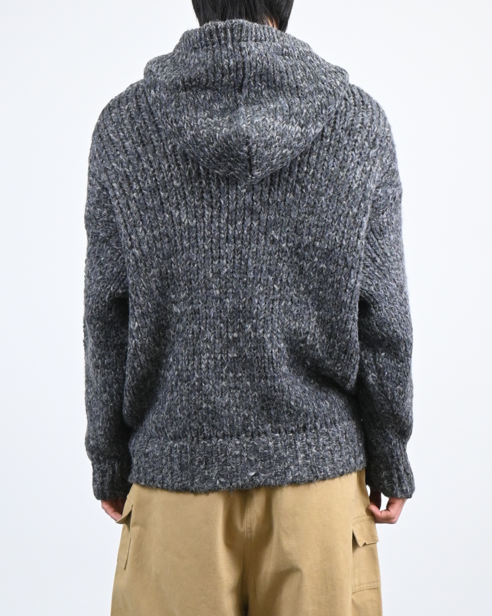 믹스된 실로 짠 후드 니트입니다.