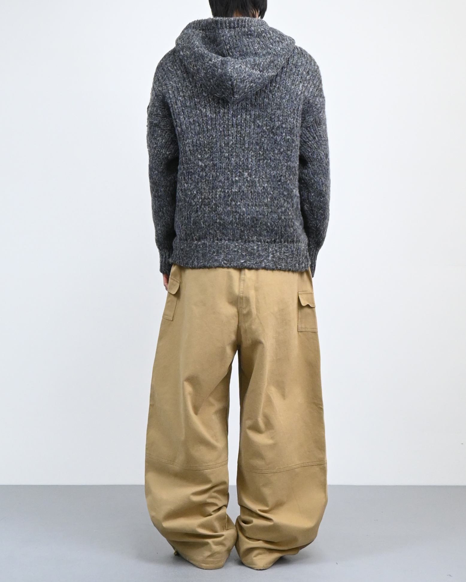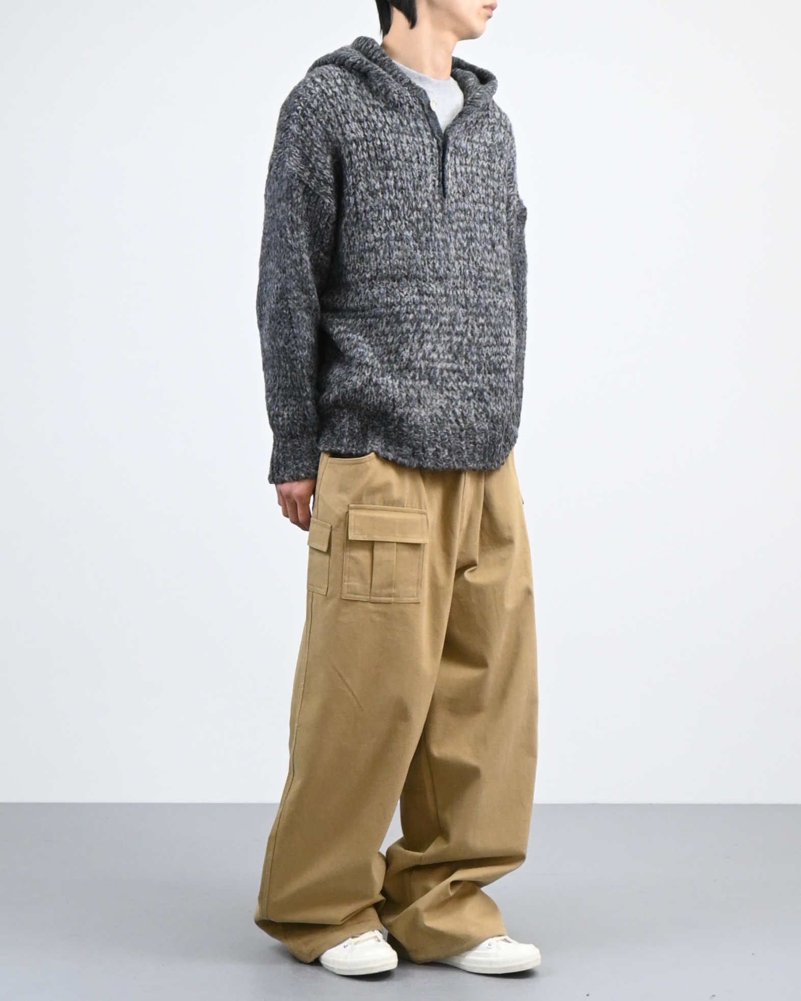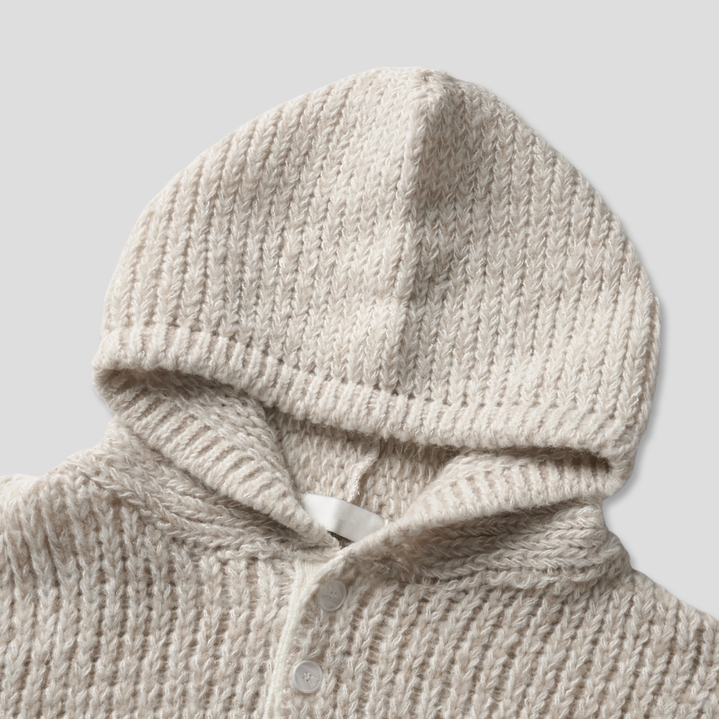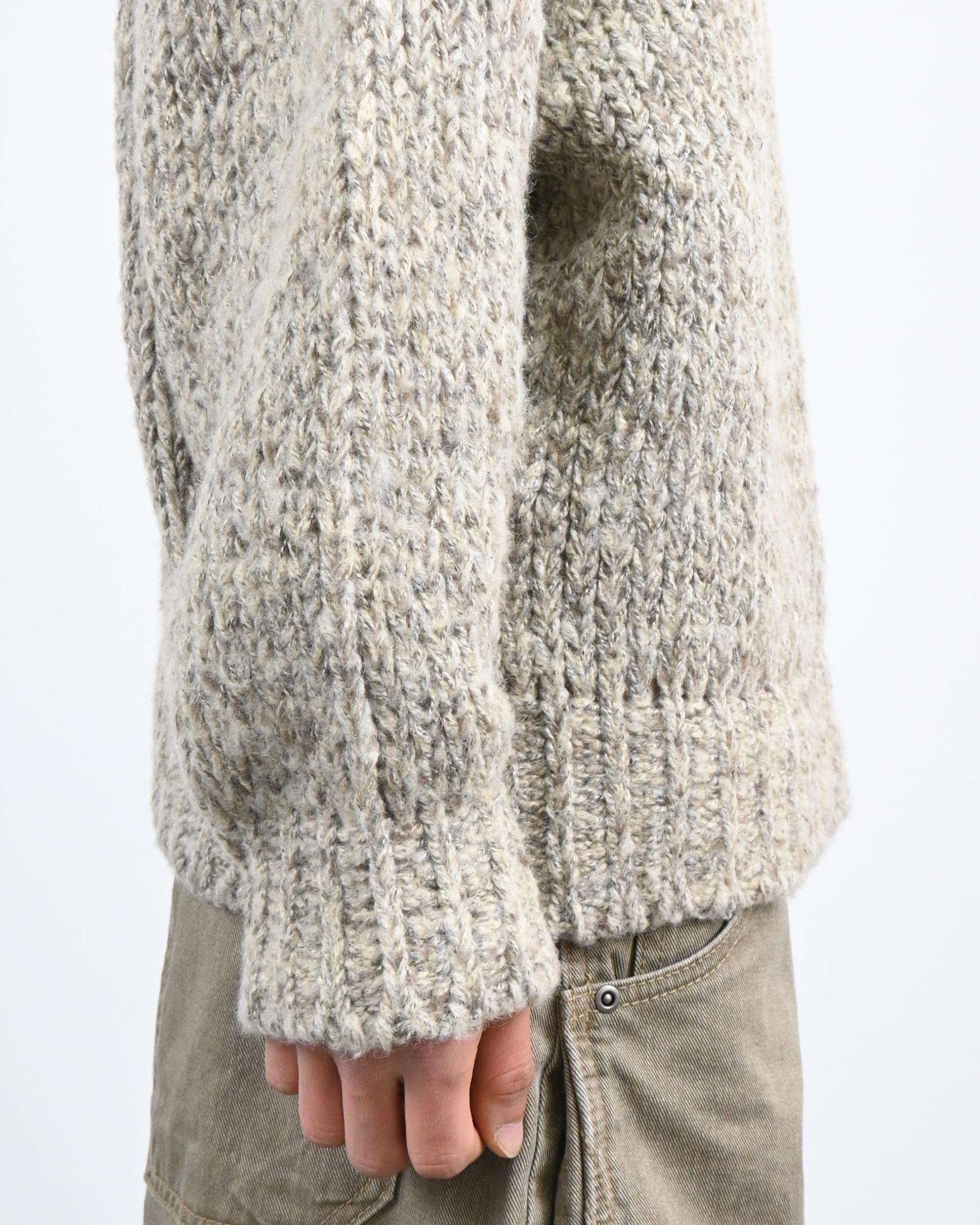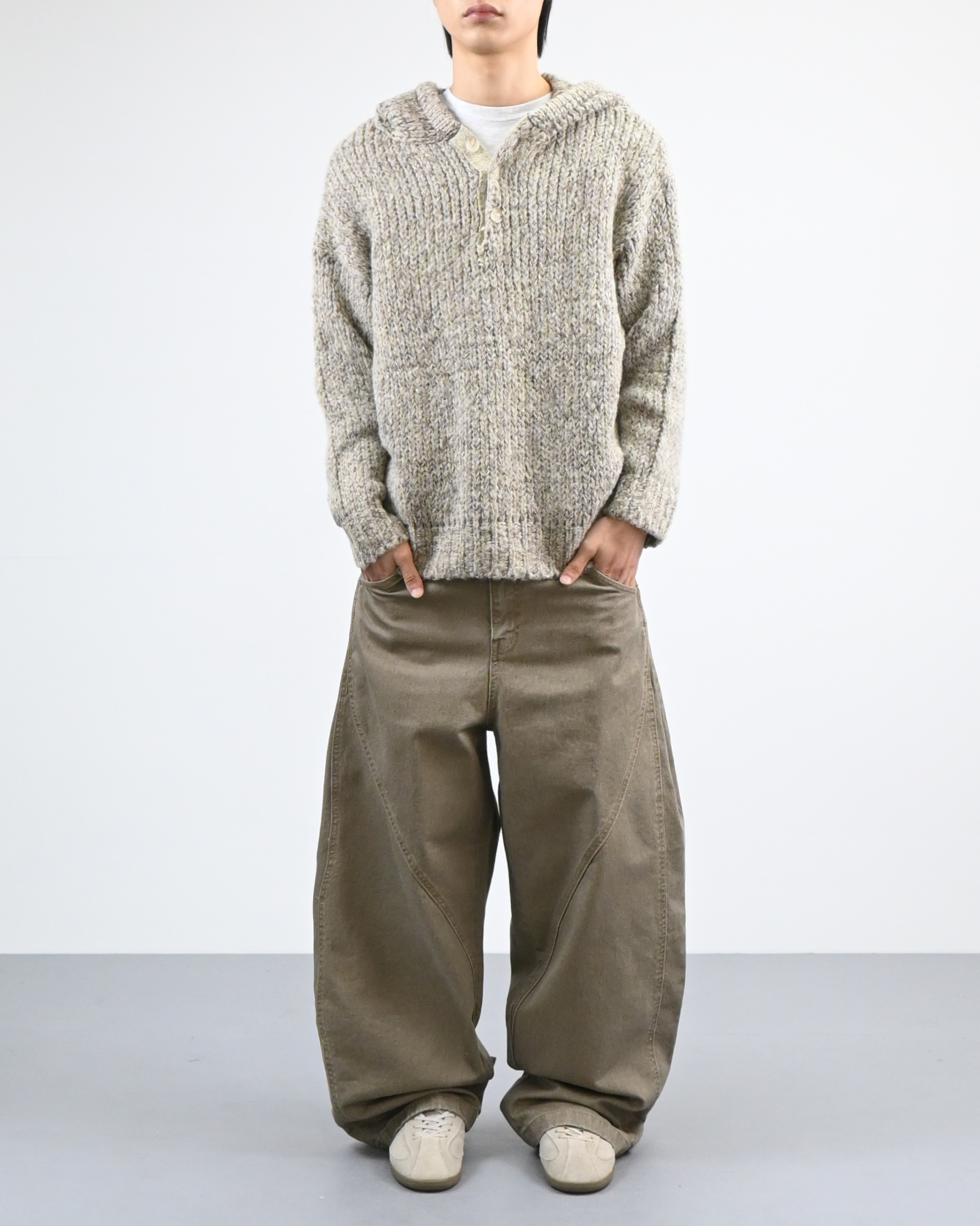 믹스된 실로 짠 후드 니트입니다.