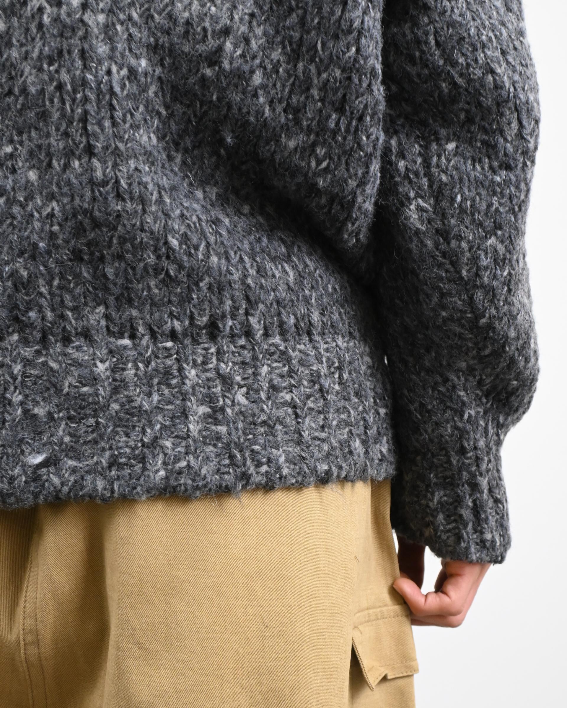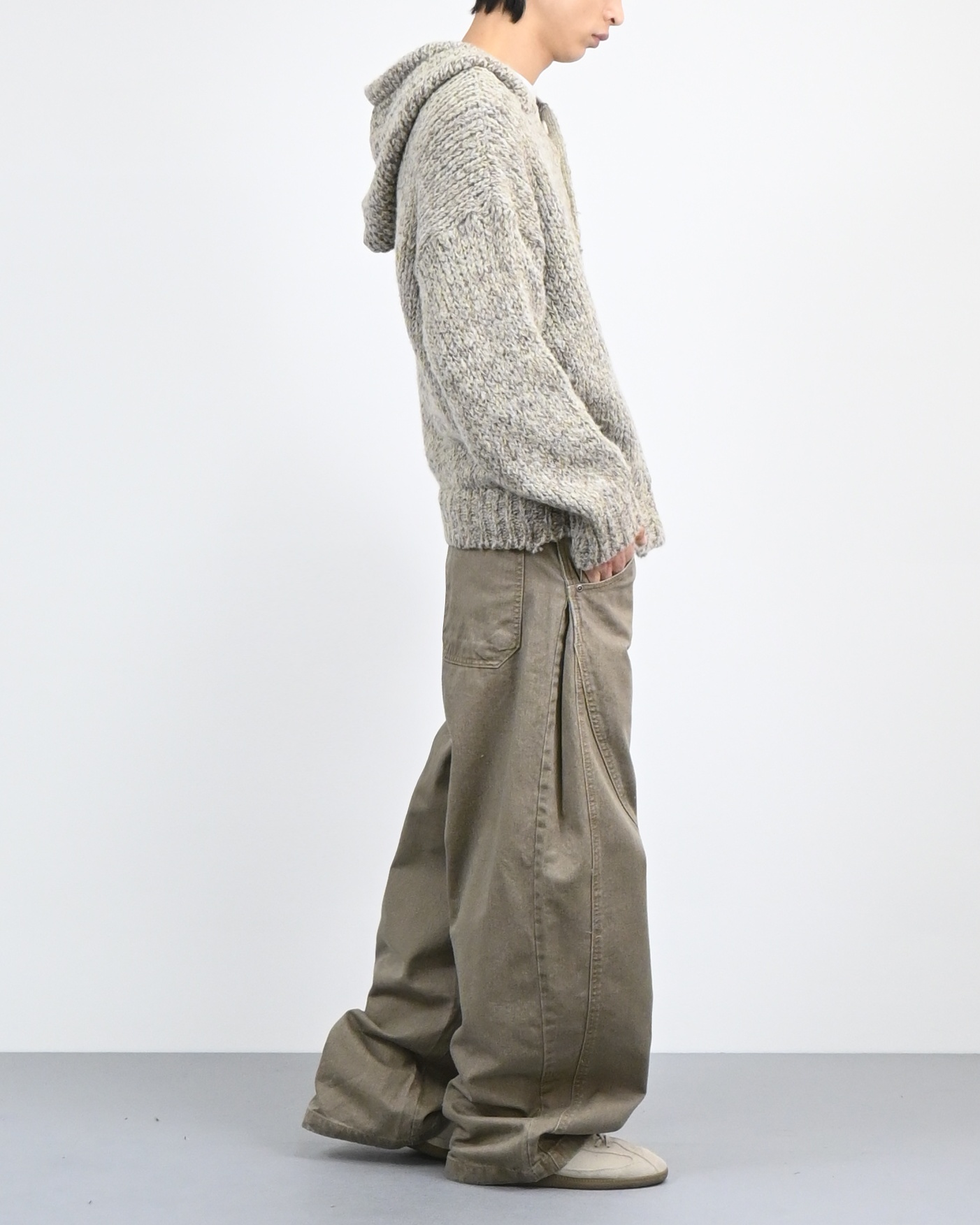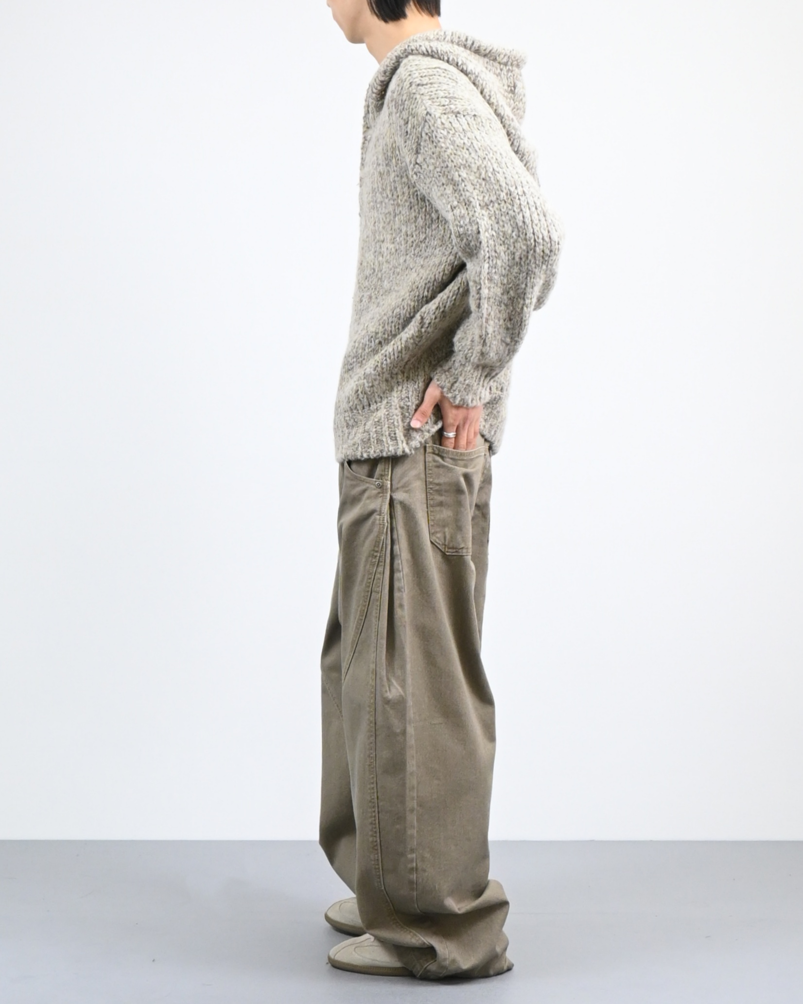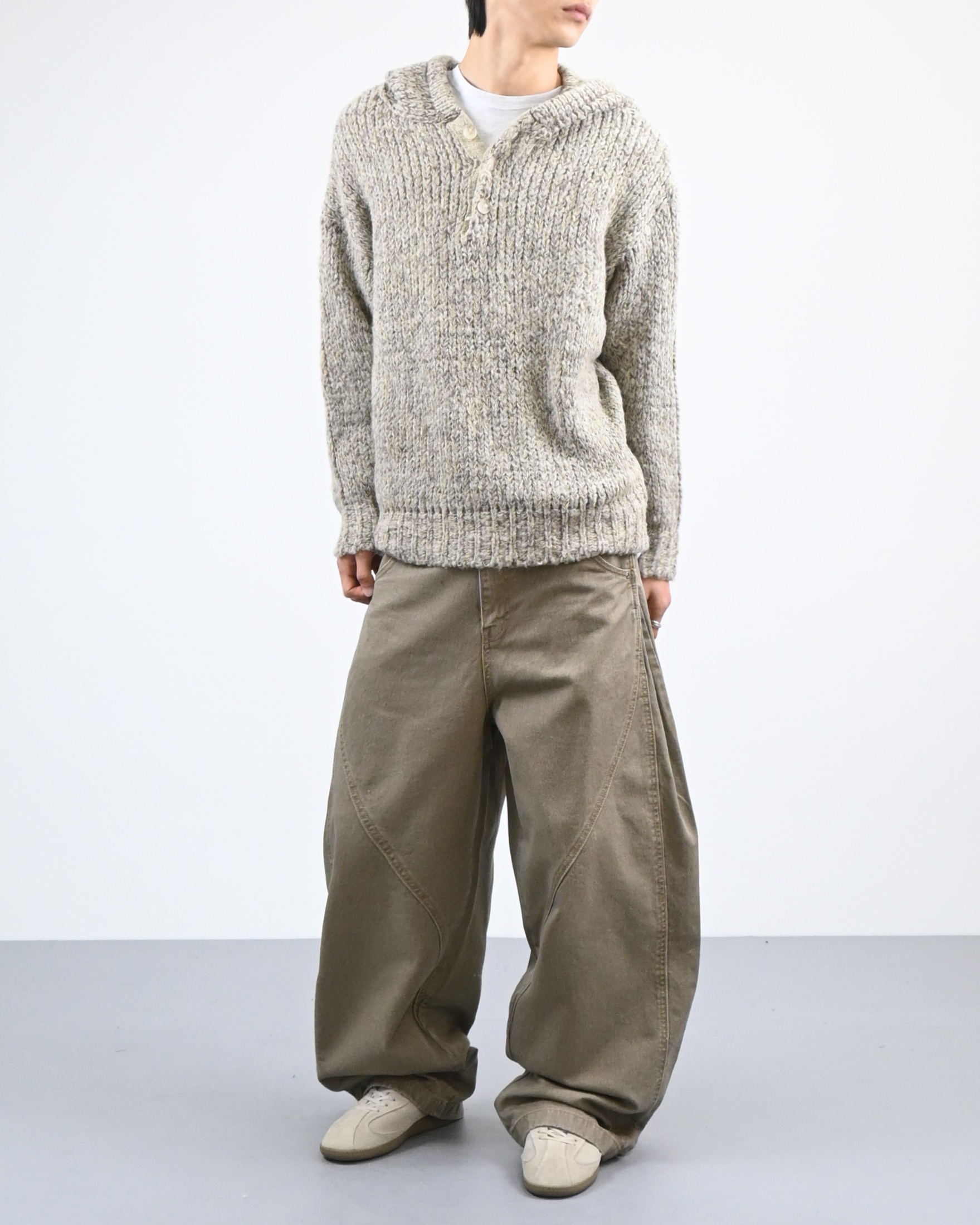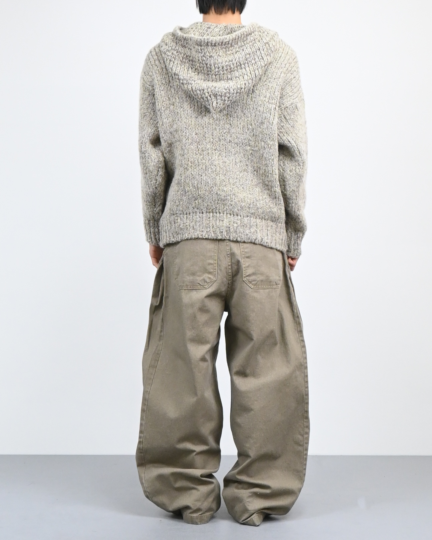 믹스된 실로 짠 후드 니트입니다.
