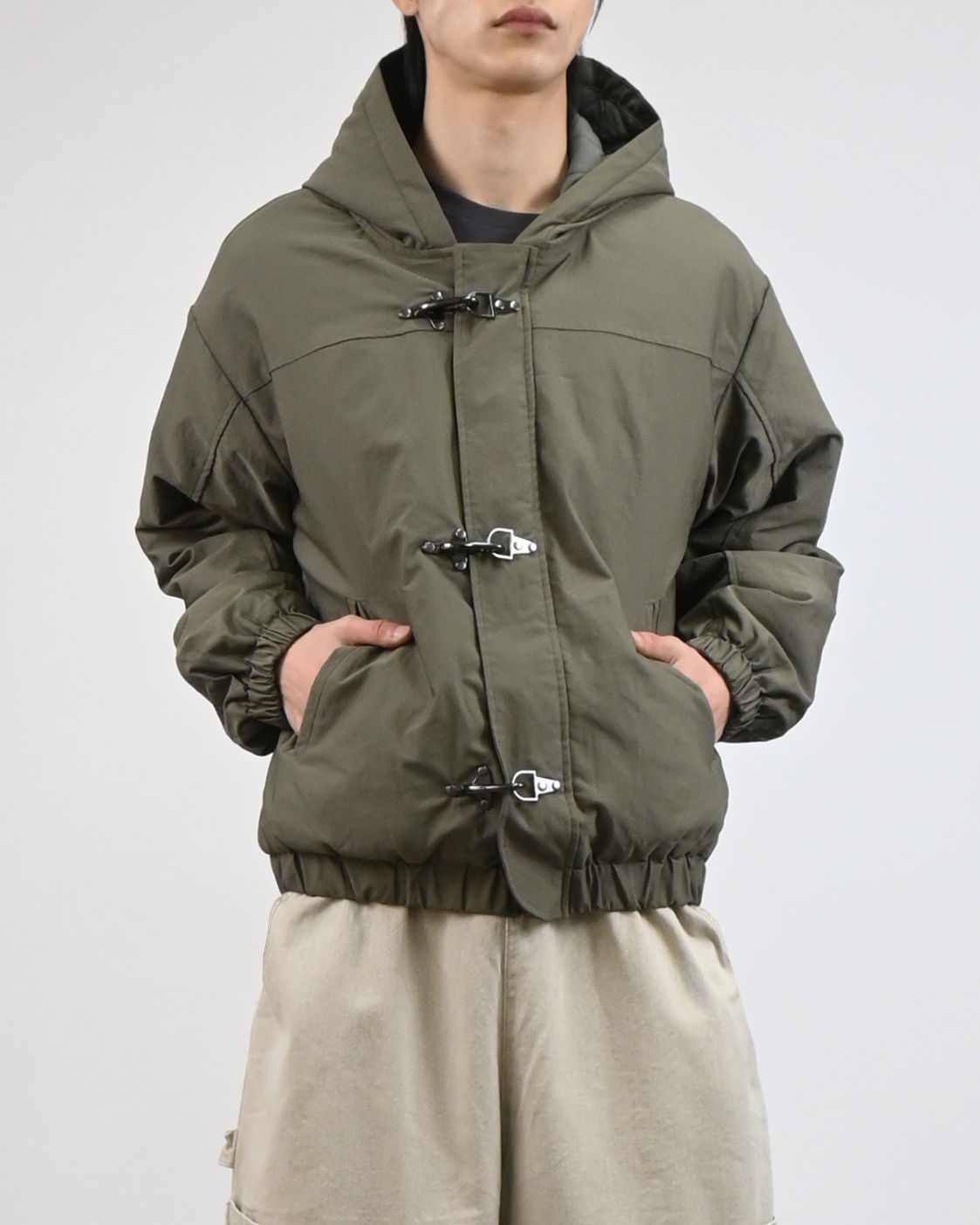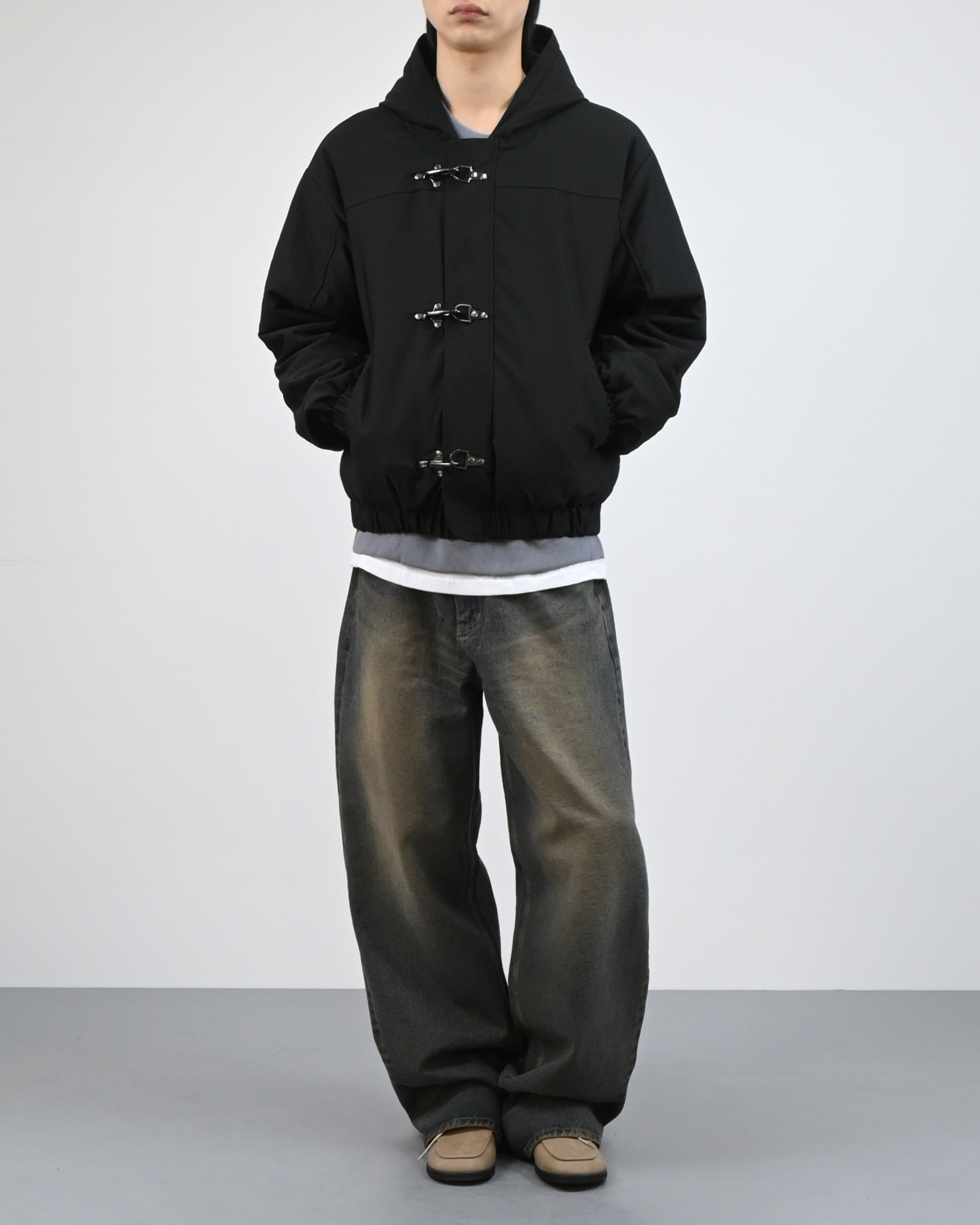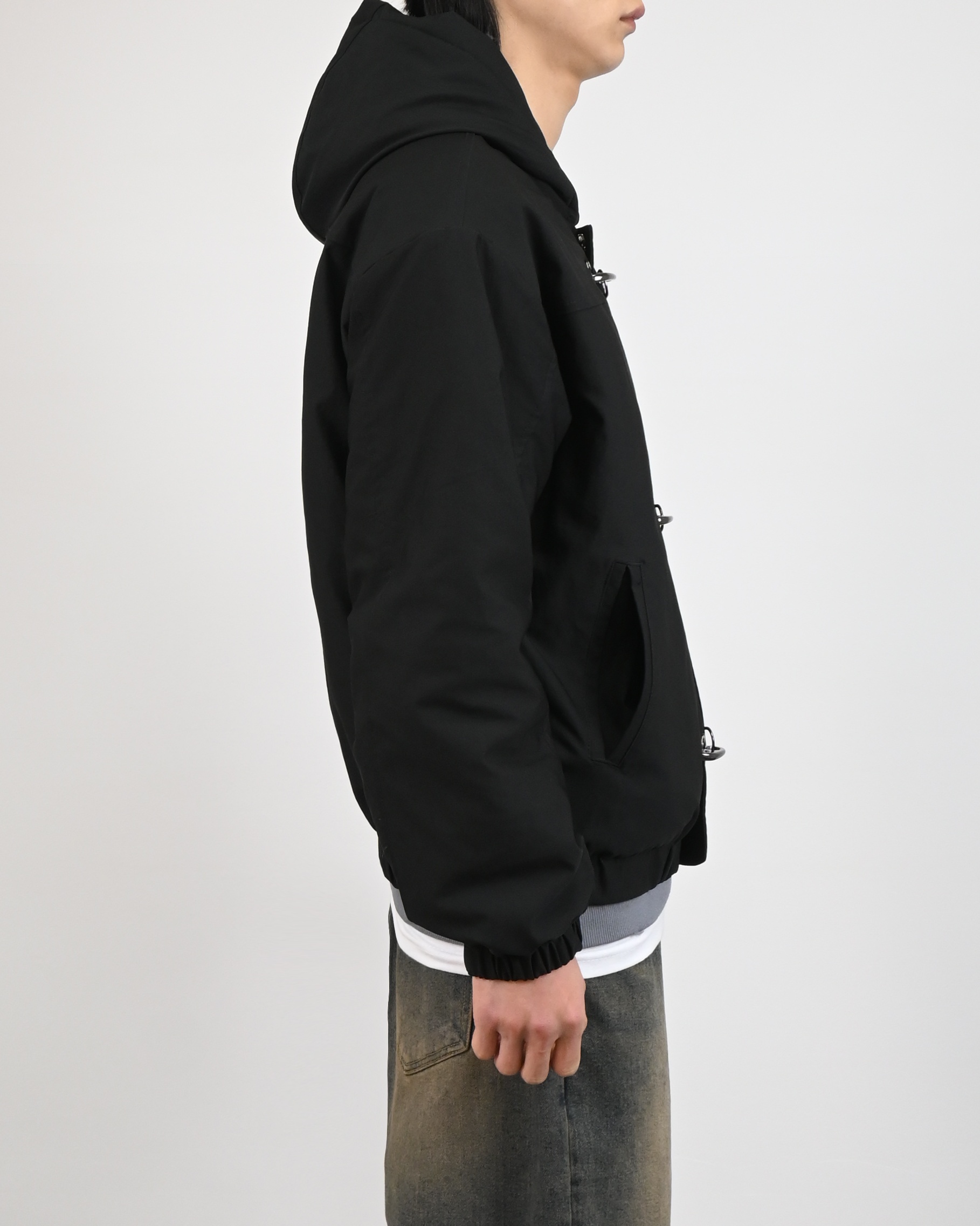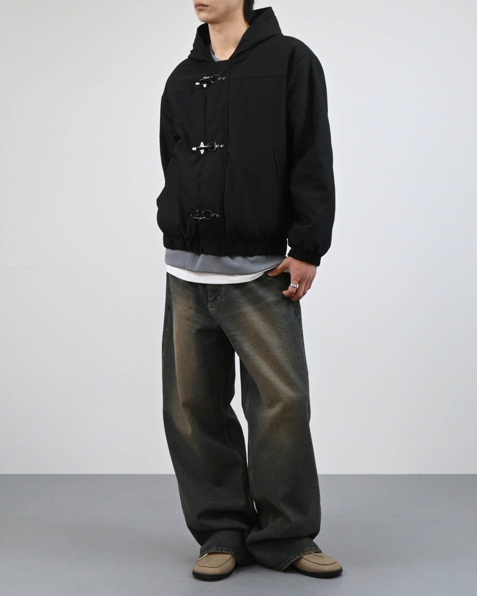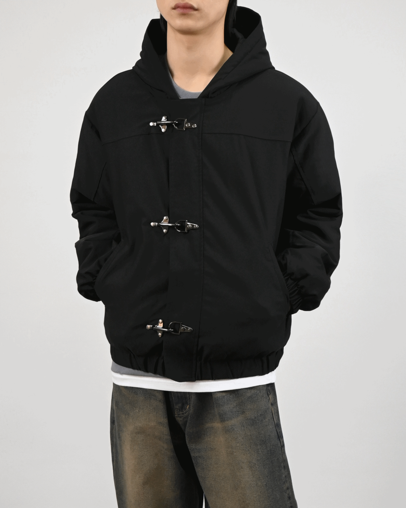 유니크한 후크가 돋보이는 점퍼입니다.