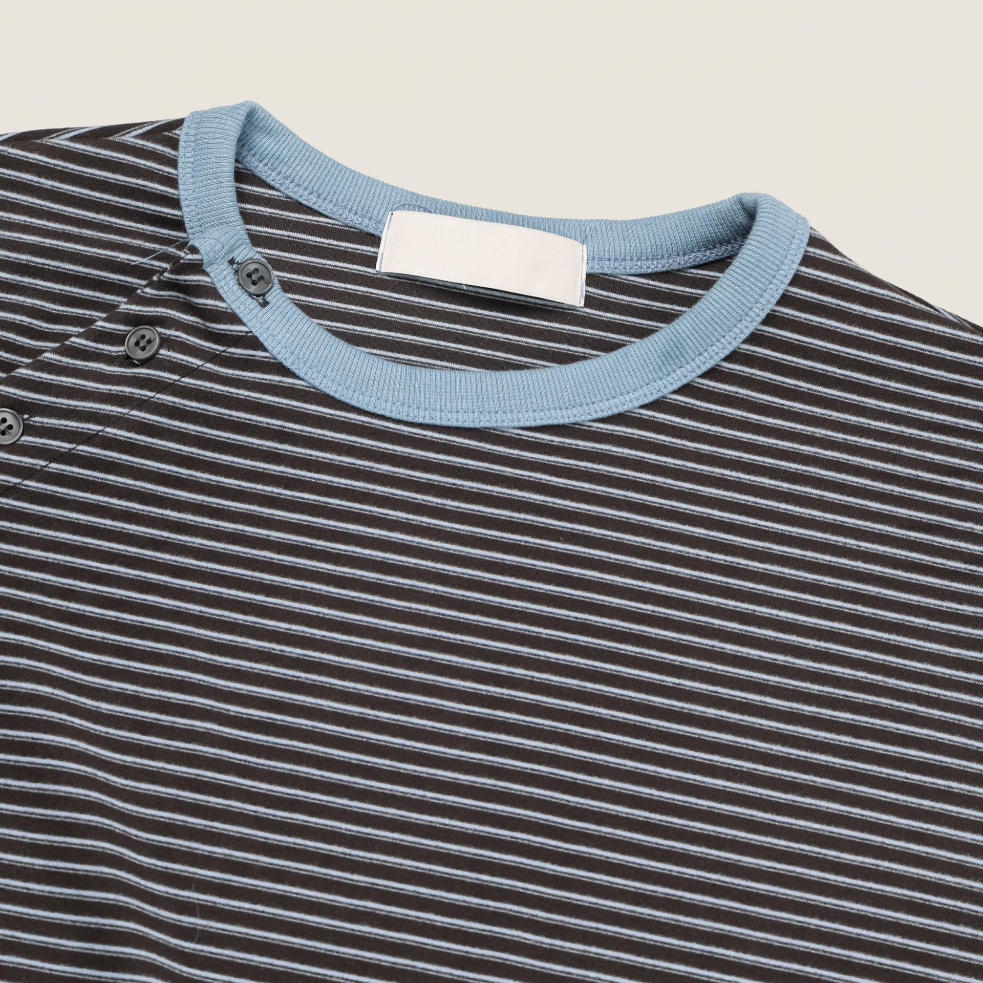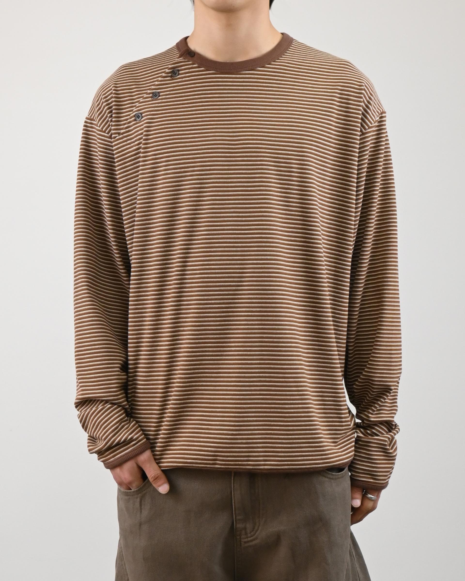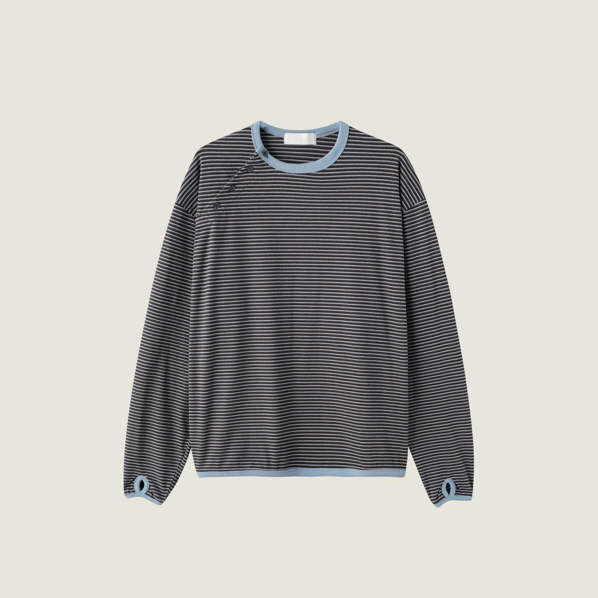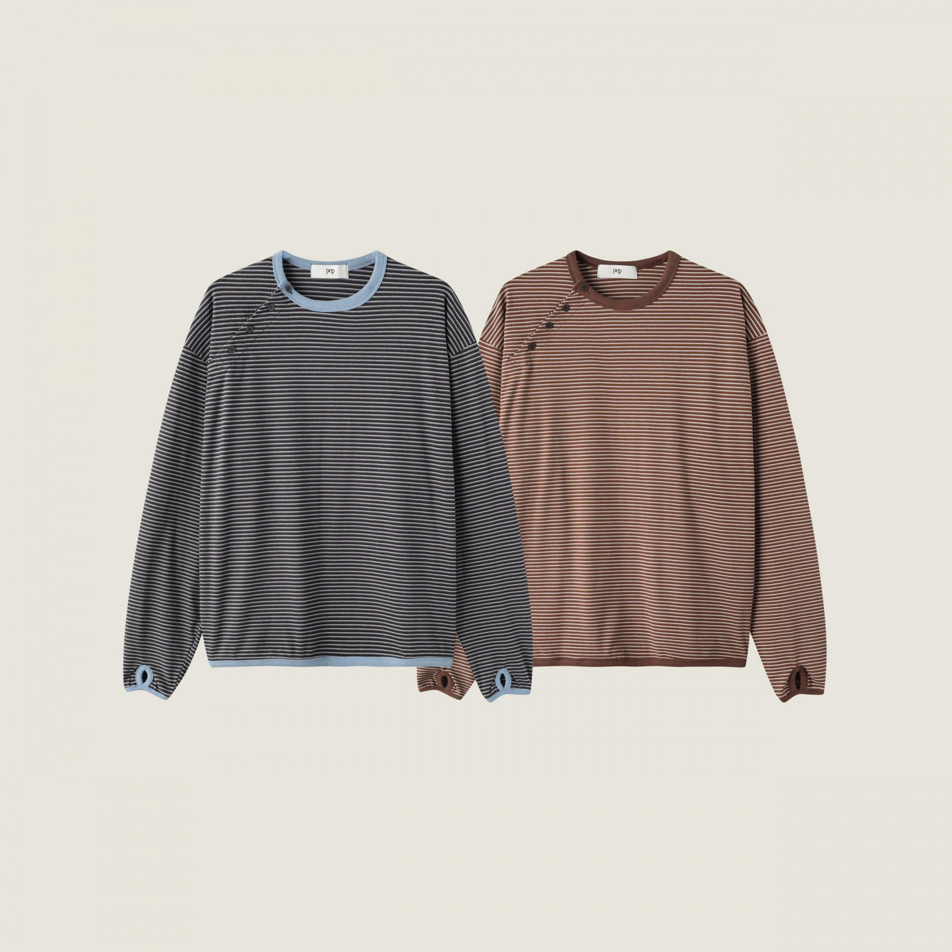 스트라이프 패턴에 스냅 디테일로 포인트를