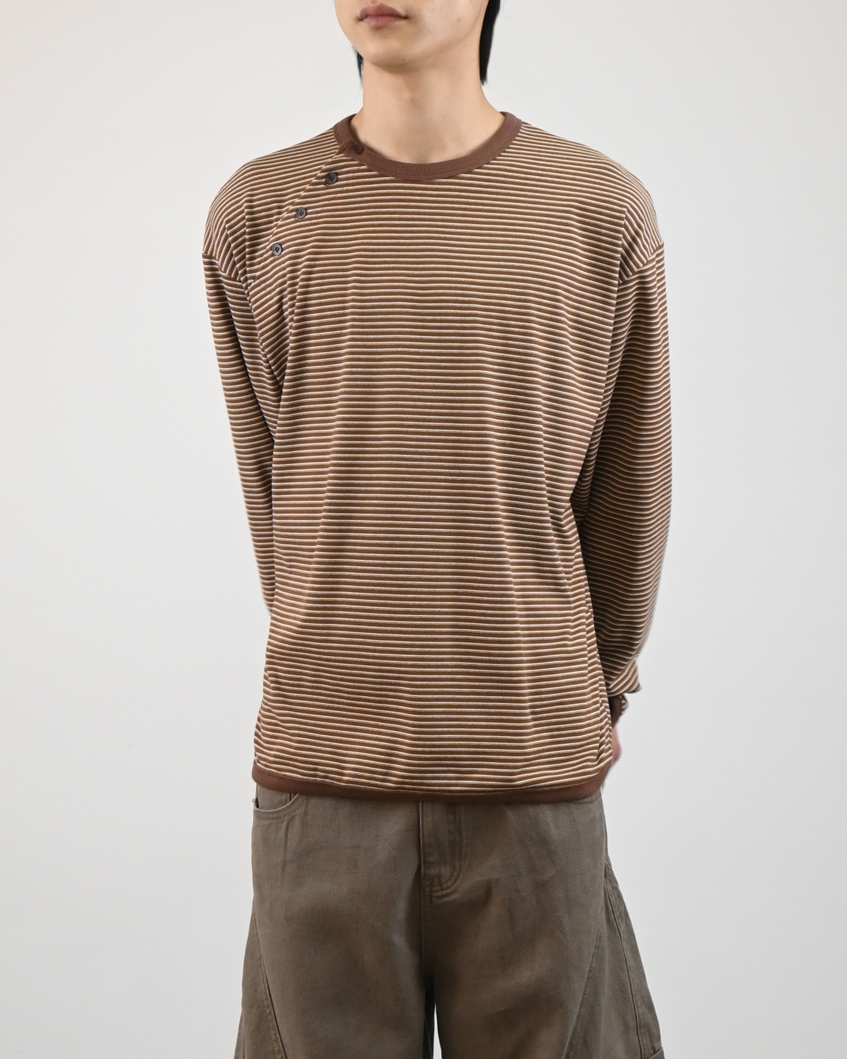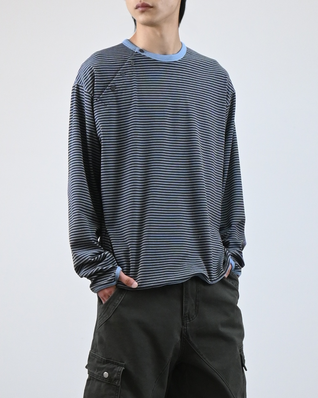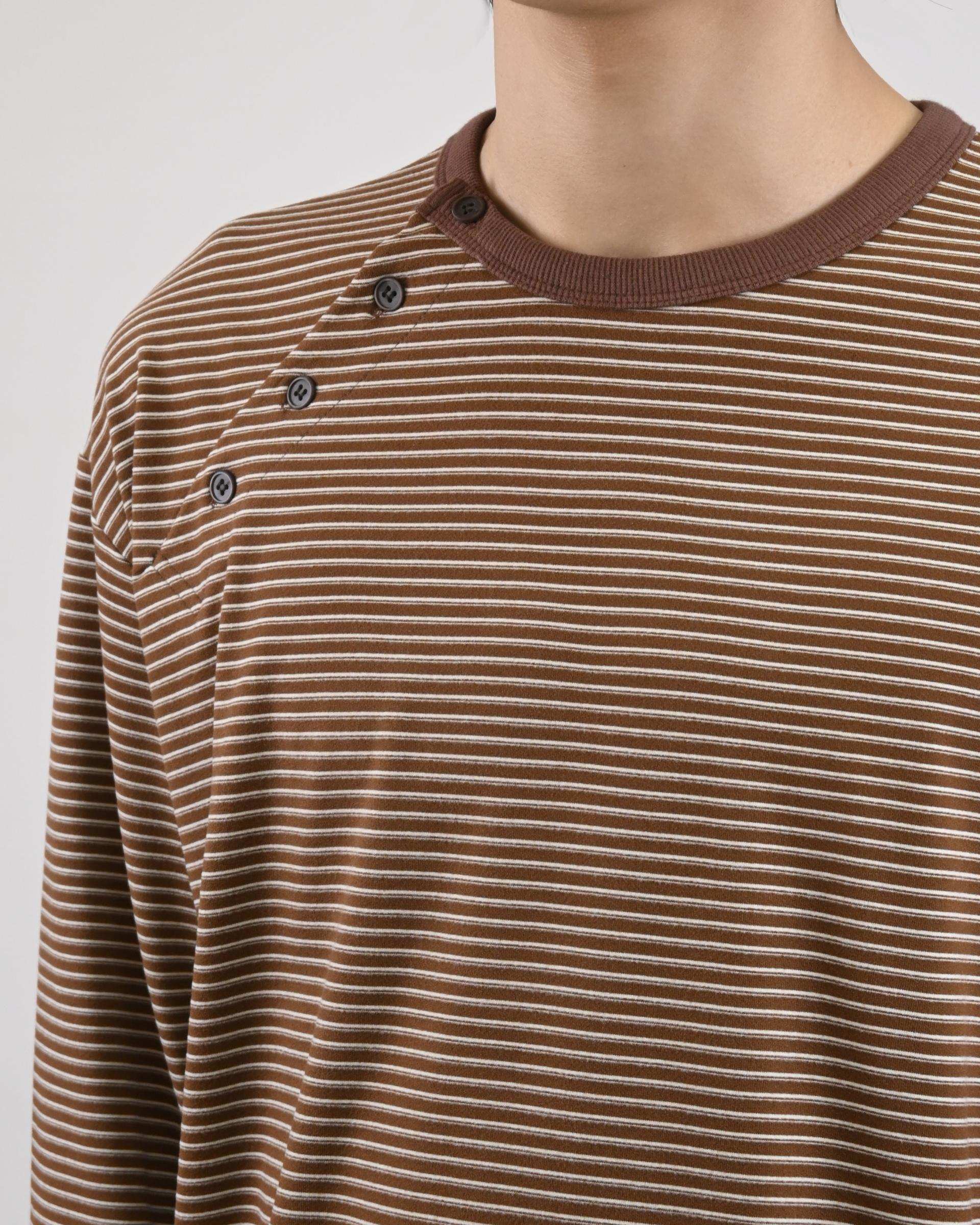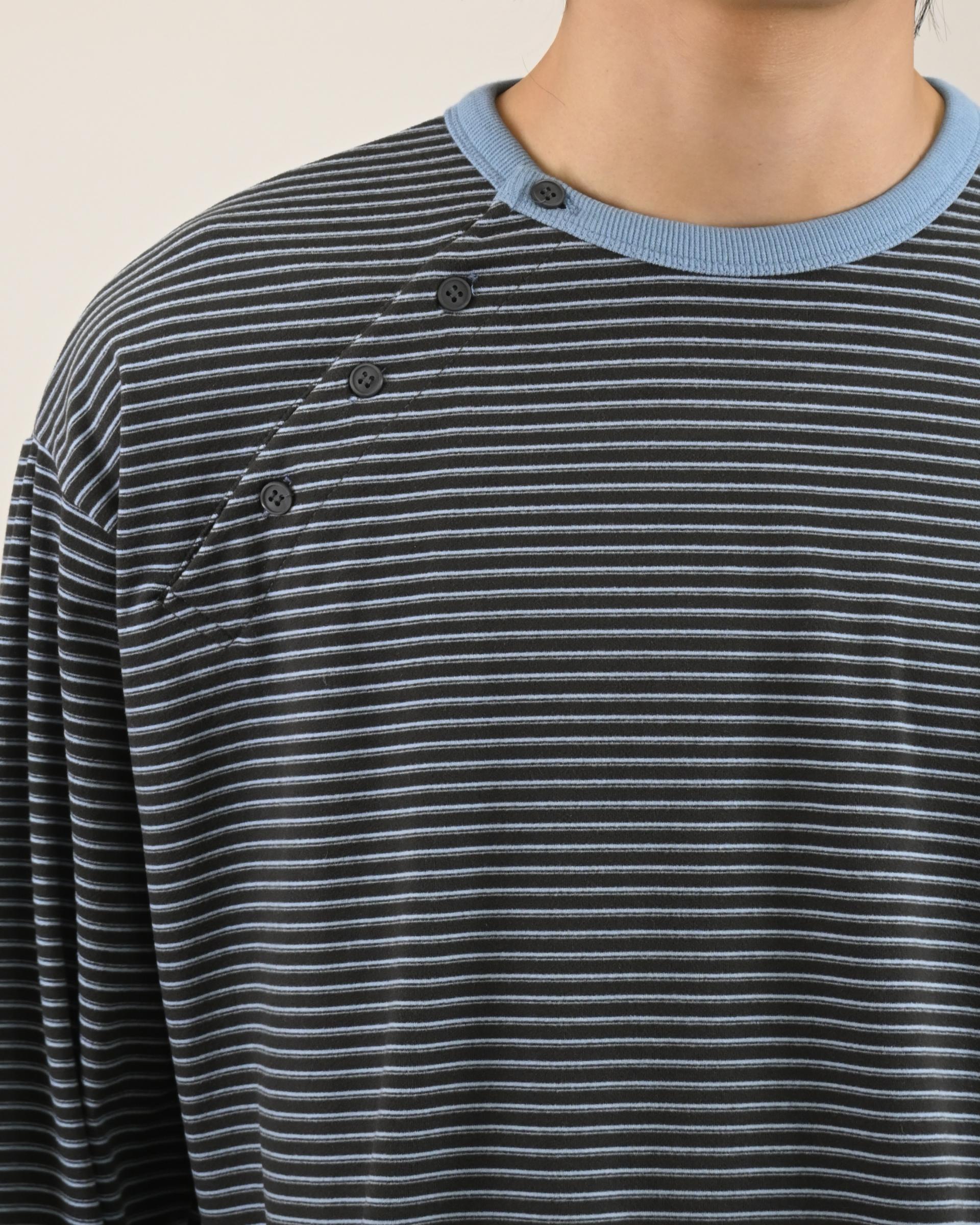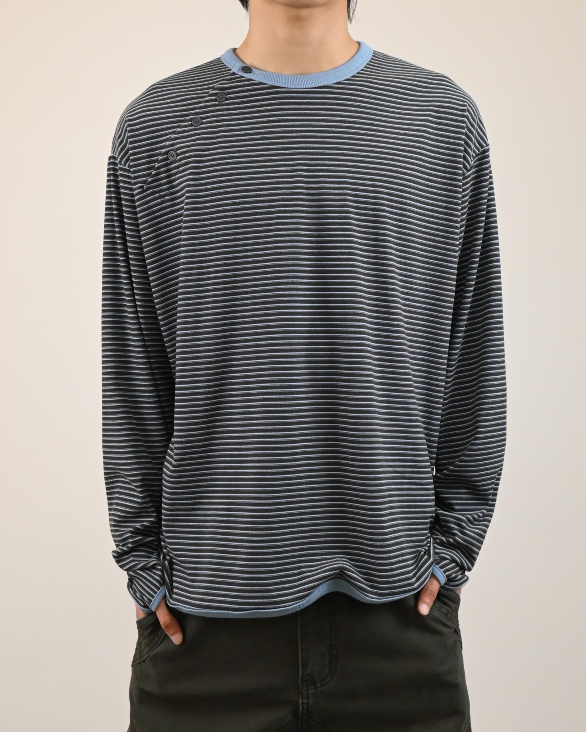 스트라이프 패턴에 스냅 디테일로 포인트를