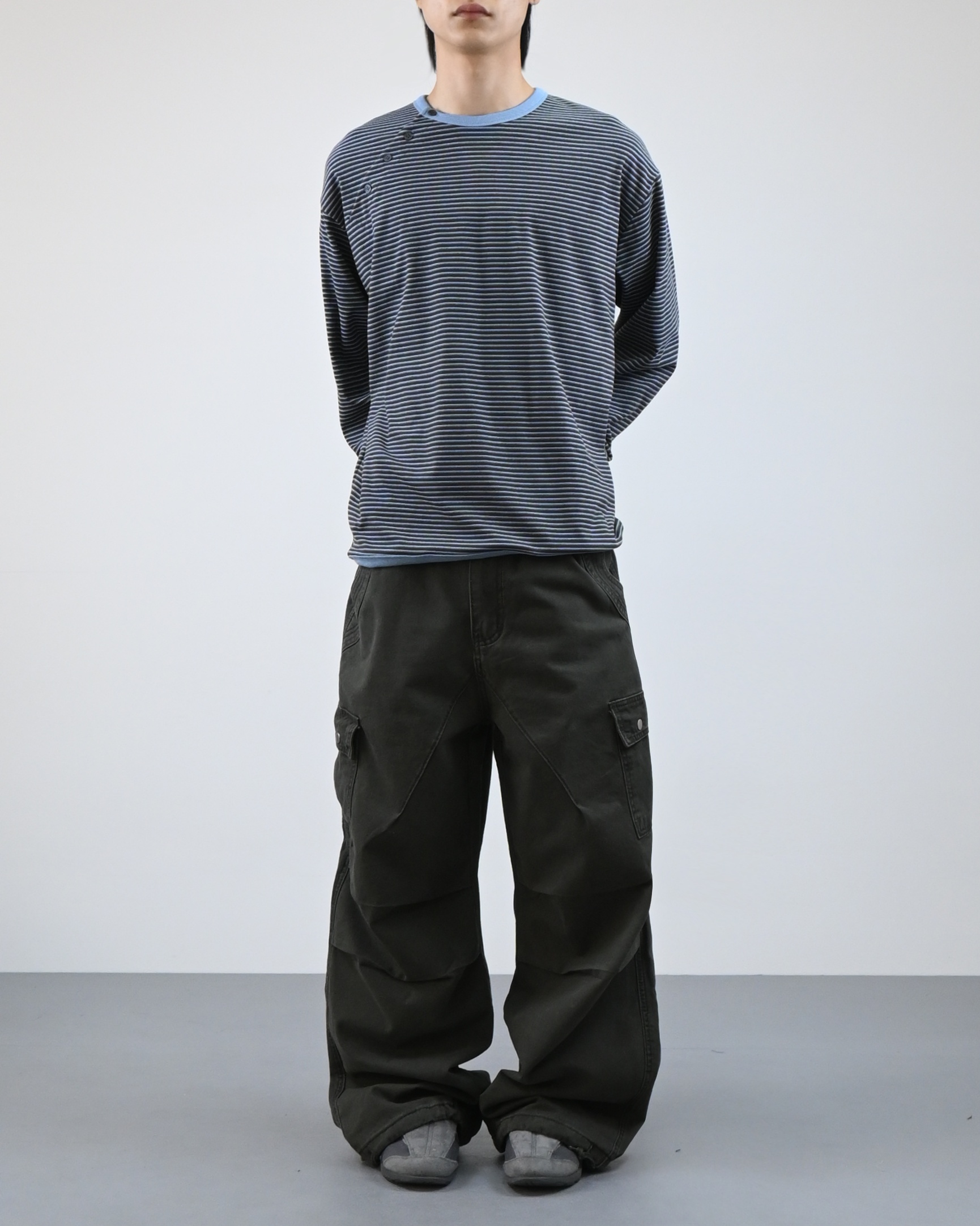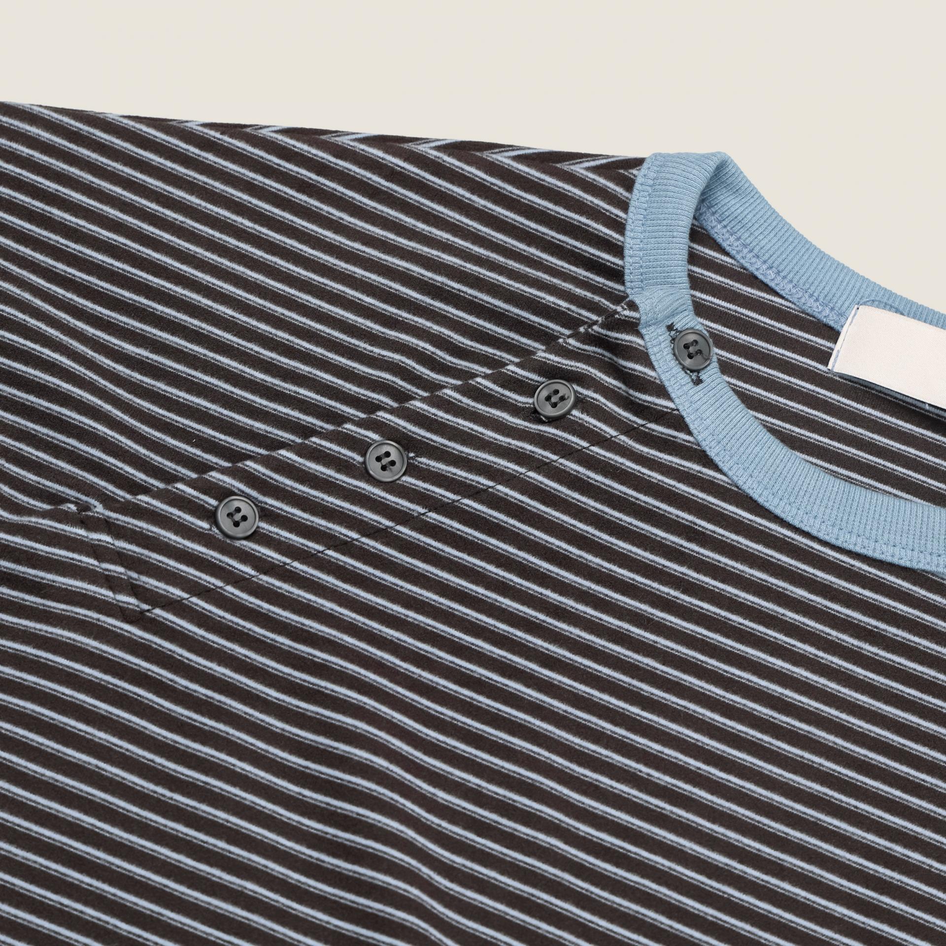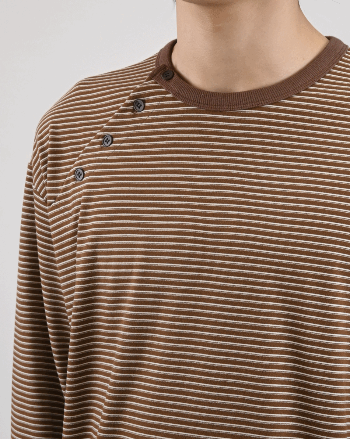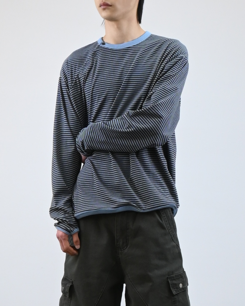 스트라이프 패턴에 스냅 디테일로 포인트를