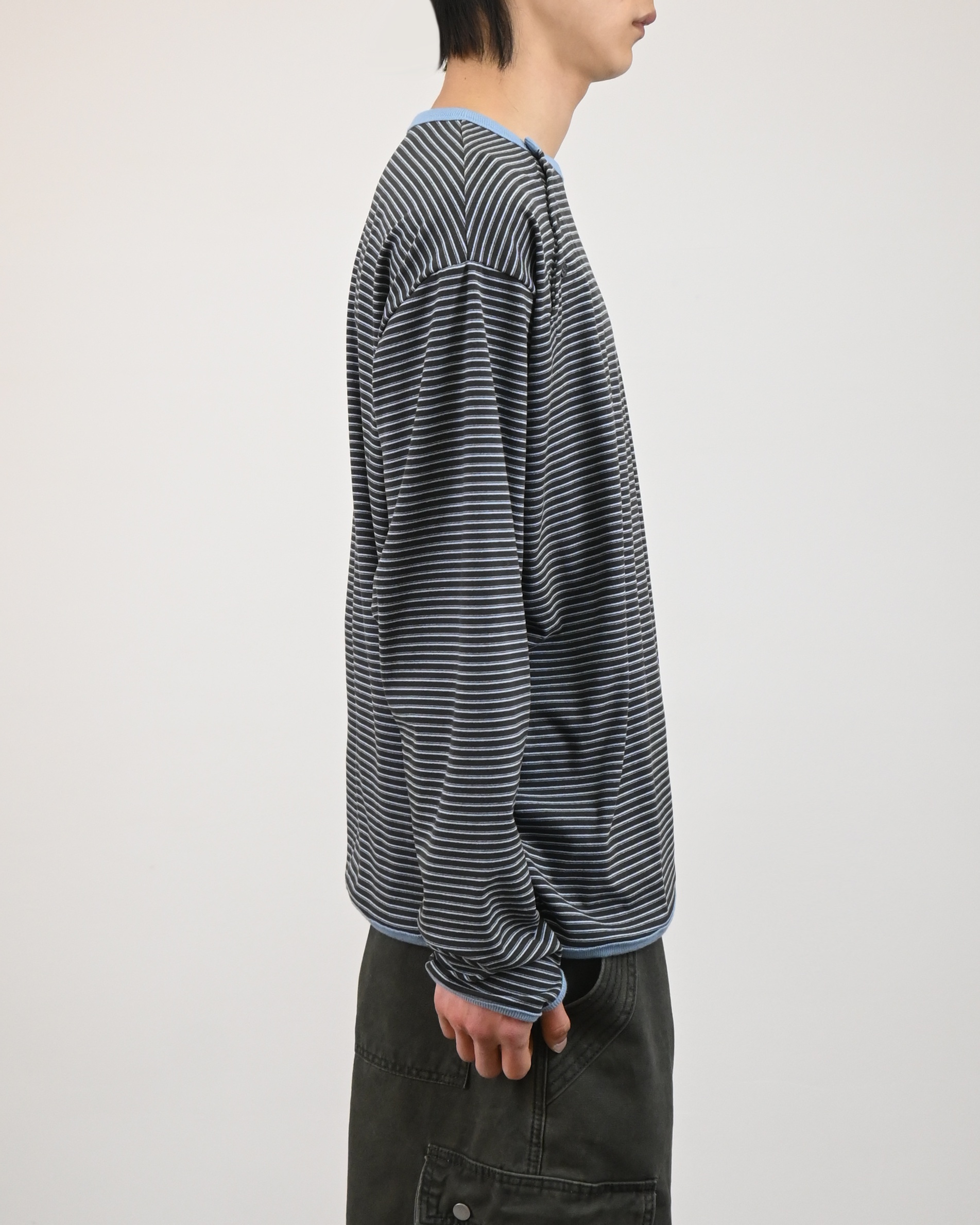 더한 롱 슬리브 넥 라인 사선으로 떨어지는 스냅과